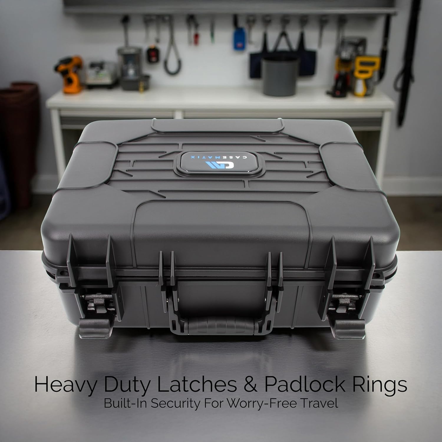**HEAVY-DUTY EXTERIOR BUILD:** Built to withstand the rigors of travel, the exterior features a reinforced hard-shell design constructed from high-strength materials. It is designed to resist water, dust, and impact, keeping your electronics safe from environmental elements. The case includes a reinforced, comfortable carrying handle for easy portability and dual snap-fit latches that keep the case firmly closed, even during bumpy travel.