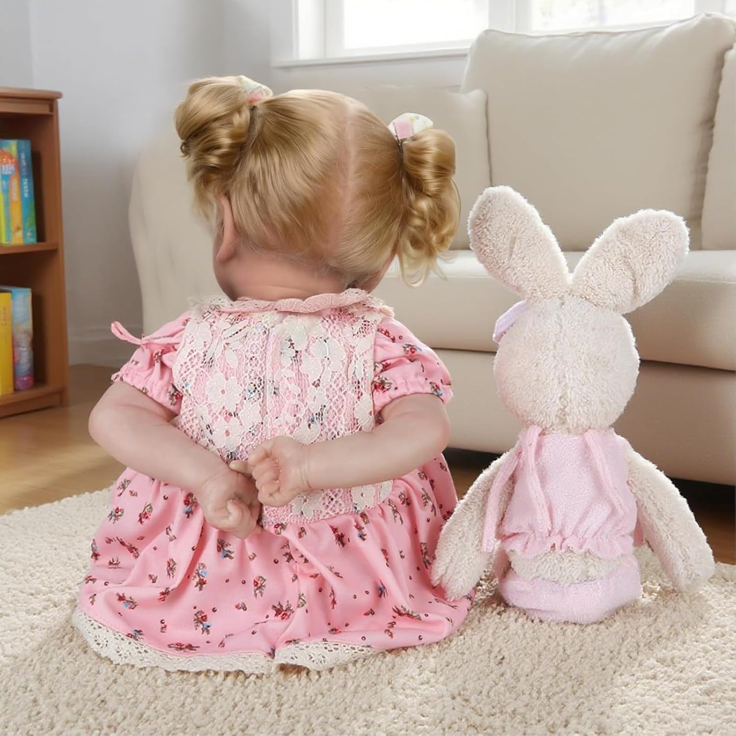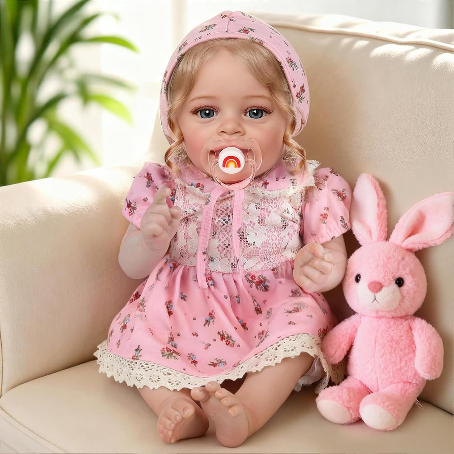 Every detail of this doll has been hand-finished for maximum realism. She boasts hand-rooted golden brown hair that is soft to the touch and styled with care. Her sparkling deep blue eyes are accented with hand-applied lashes, while her skin features delicate blushing, subtle wrinkles on her feet, and meticulously shaped half-moon fingernails. Dressed in an adorable soft pink floral dress with lace trim and a matching bonnet, she arrives looking picture-perfect.
