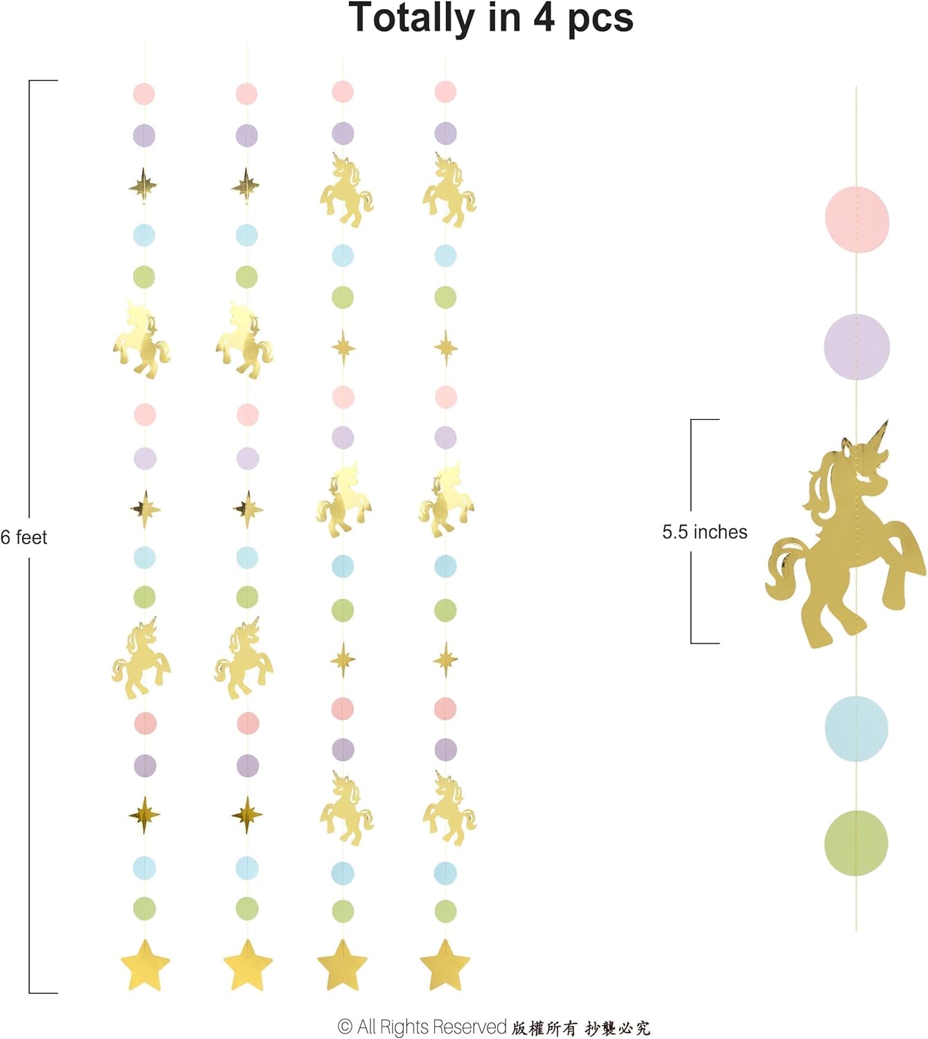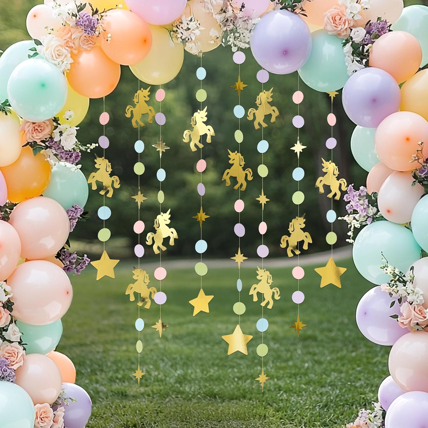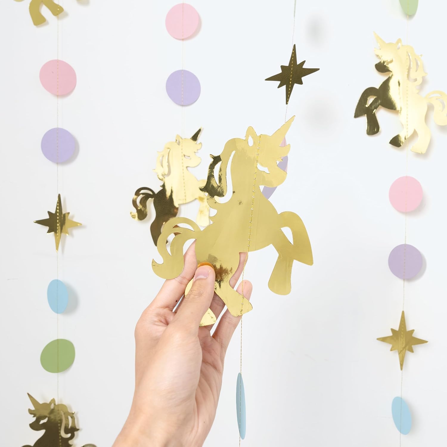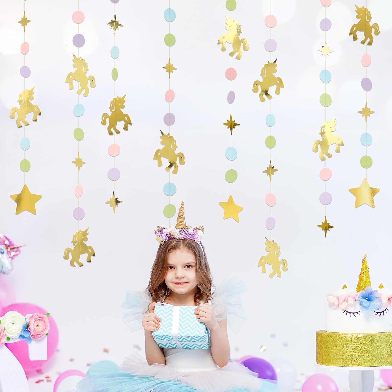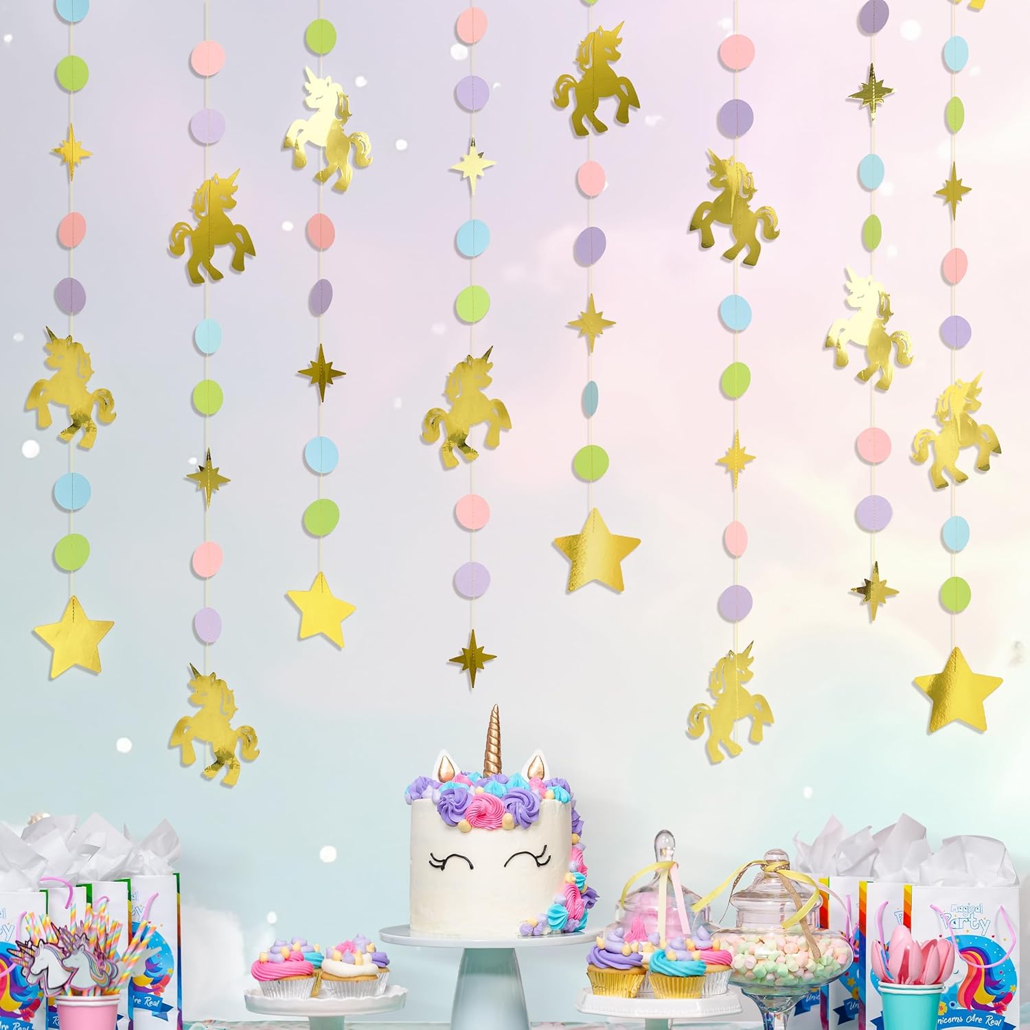 Each set includes four pre-assembled garlands measuring 6 feet each, providing a generous total of 24 feet of decoration. Crafted from premium cardstock with glitter accents and durable string, these banners are both lightweight and sturdy, allowing for easy hanging on walls, ceilings, cake tables, or photo booth backdrops. No DIY is required—simply unpack and display. The reusable design ensures that these charming decorations can be stored and enjoyed for future parties or as everyday room décor. Pair perfectly with unicorn balloons and tableware for a complete look.
