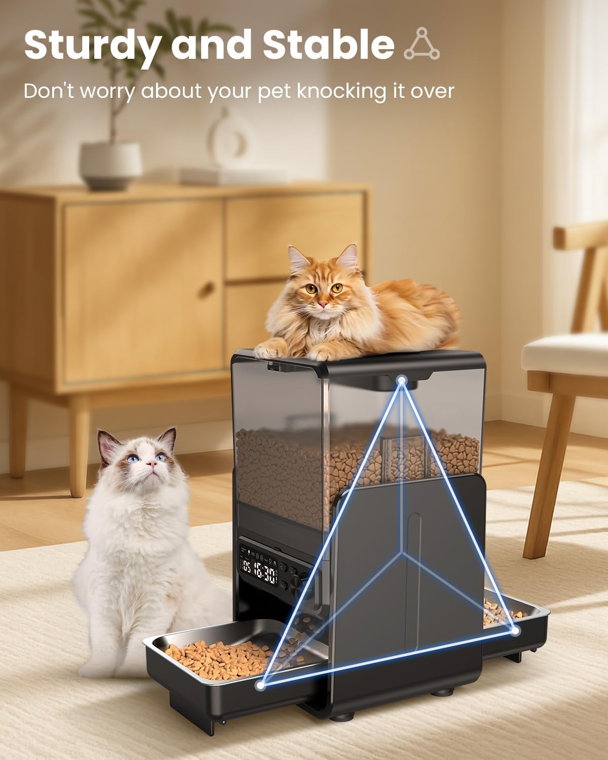 Reliability You Can Trust: Never worry about a power outage again. The feeder boasts a dual-power supply system, running on a power adapter while supported by 4 AA batteries (not included) for automatic backup. The 45-day battery life ensures your pets are fed during extended trips. The transparent BPA-free hopper makes monitoring food levels effortless, and the secure locking lid keeps curious paws out while keeping kibble fresh with a built-in desiccant.