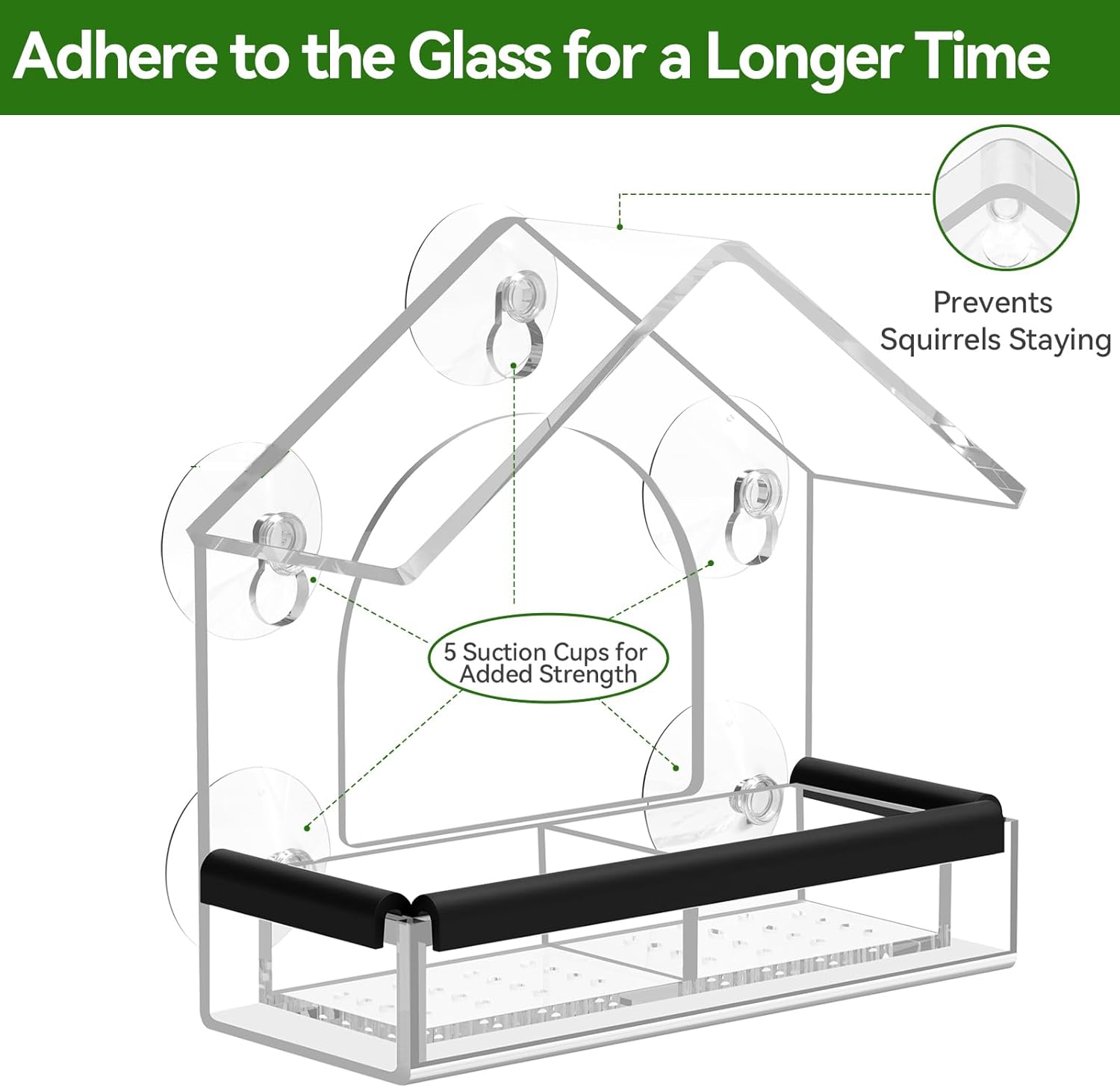 • UPGRADED SUCTION POWER: Equipped with 5 heavy-duty suction cups to ensure the feeder stays securely attached to your window, even under harsh weather conditions or when multiple birds land at once.