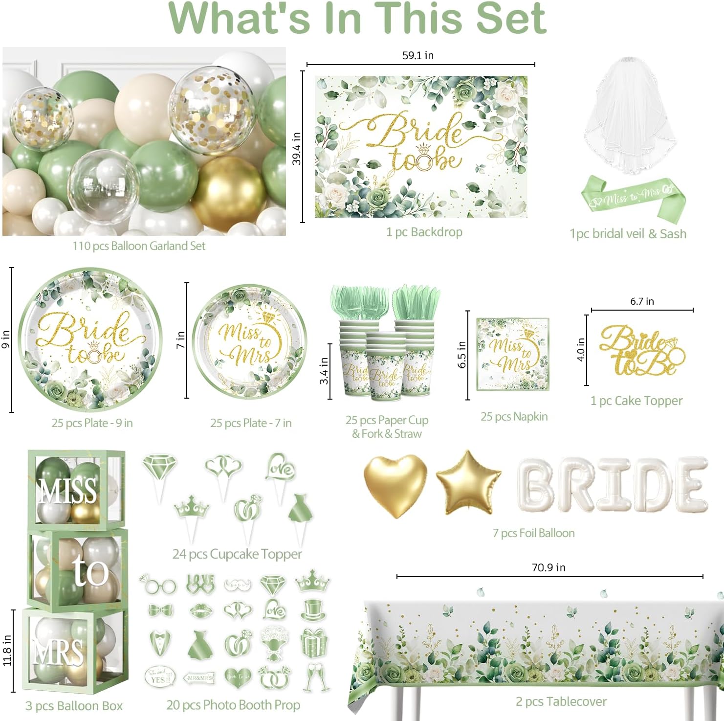Elevate your special occasion with the cocomigo 320 PCS Sage Green Bridal Shower Decorations Set. Designed for the modern bride, this all-in-one kit combines elegance and convenience, featuring a stunning ‘Bride to Be’ backdrop, an eye-catching balloon arch with gold accents, and durable, disposable tableware service for 25 guests.