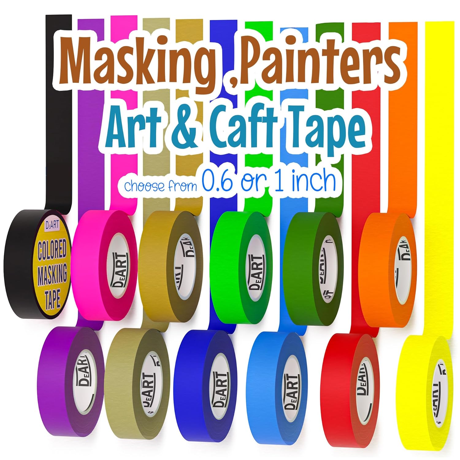- VERSATILE VALUE PACK: Choose from 8 or 12 rolls of vibrant colored masking tape. Includes rich hues like red, yellow, green, pink, and blue. Each roll is 11 yards long, available in 1 inch or 0.6 inch widths.