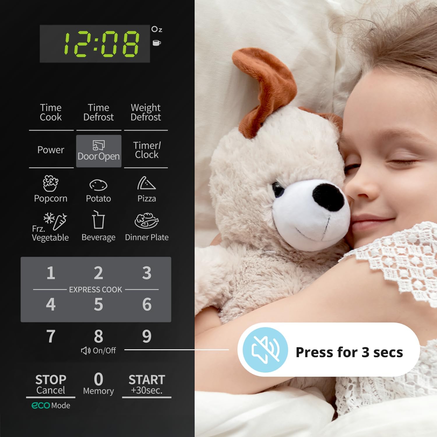 Quiet & Energy Efficient Design: Enjoy a peaceful kitchen environment with the unique Sound On/Off feature. A simple mute button allows you to silence the microwave beeps, making it ideal for late-night snacks or quiet offices. Additionally, the ECO Mode helps reduce energy consumption by turning off the LED display when the unit is not in active use.