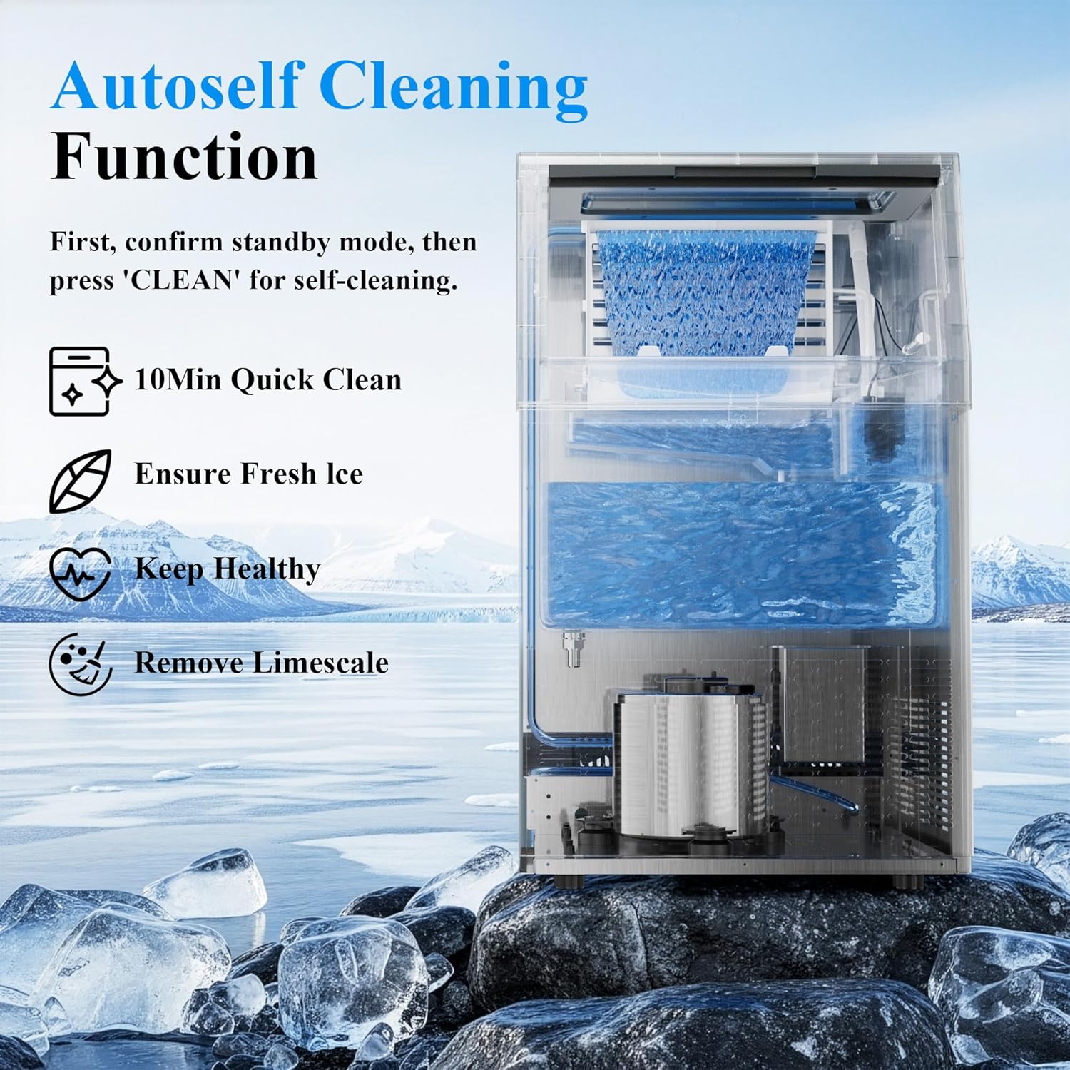 • Effortless Maintenance: Stay hygienic with minimal effort. The one-touch automatic self-cleaning function flushes the system, while the included water filter ensures ice purity and great taste.