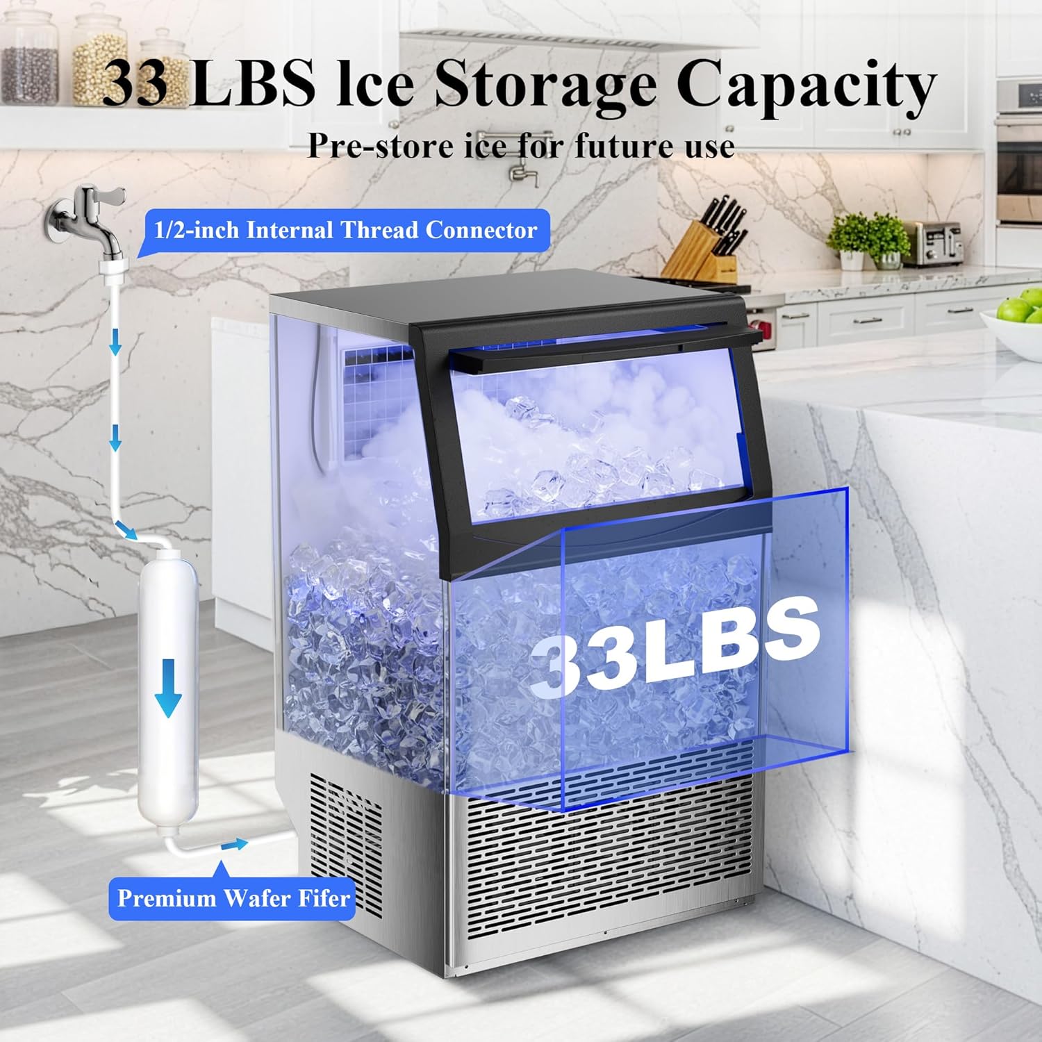 • High-Capacity Output: Produces up to 110 lbs of restaurant-quality ice per day with a 33 lbs storage bin, perfect for high-demand venues.