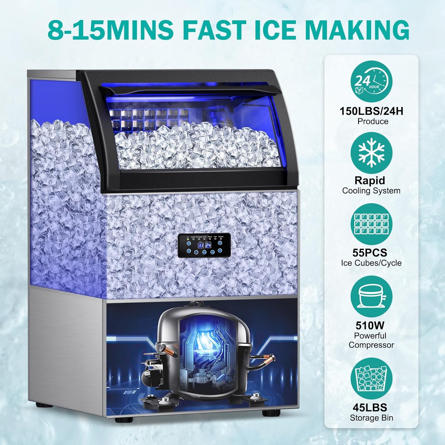 - Rapid Freezing: Generates 55 clear, restaurant-quality ice cubes in just 8-15 minutes.