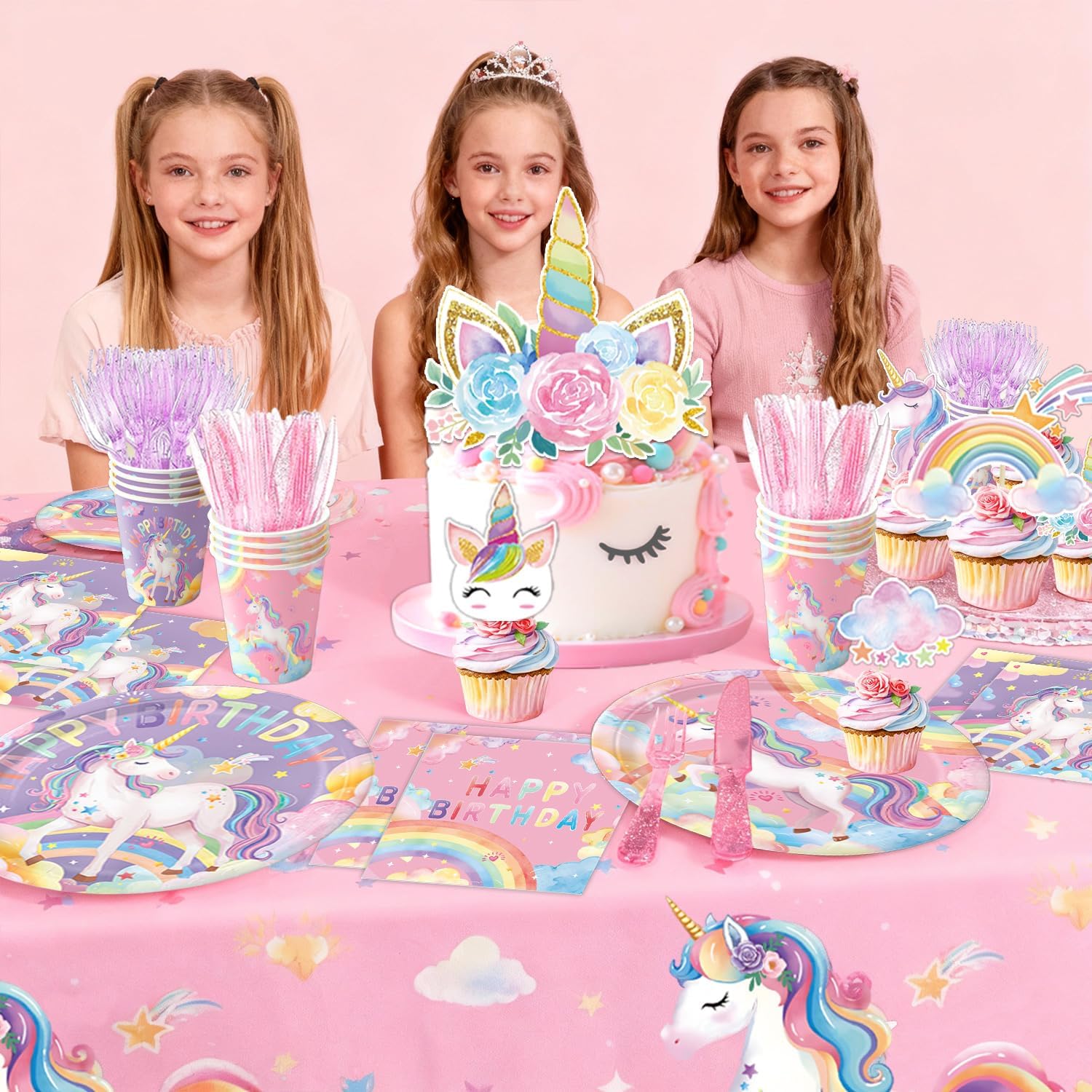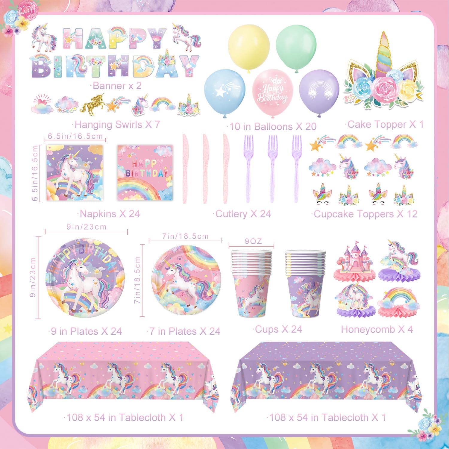 - MAGICAL UNICORN THEME: Features a colorful design of unicorns, rainbows, stars, and flowers that creates a dreamy atmosphere perfect for any girl’s birthday celebration.