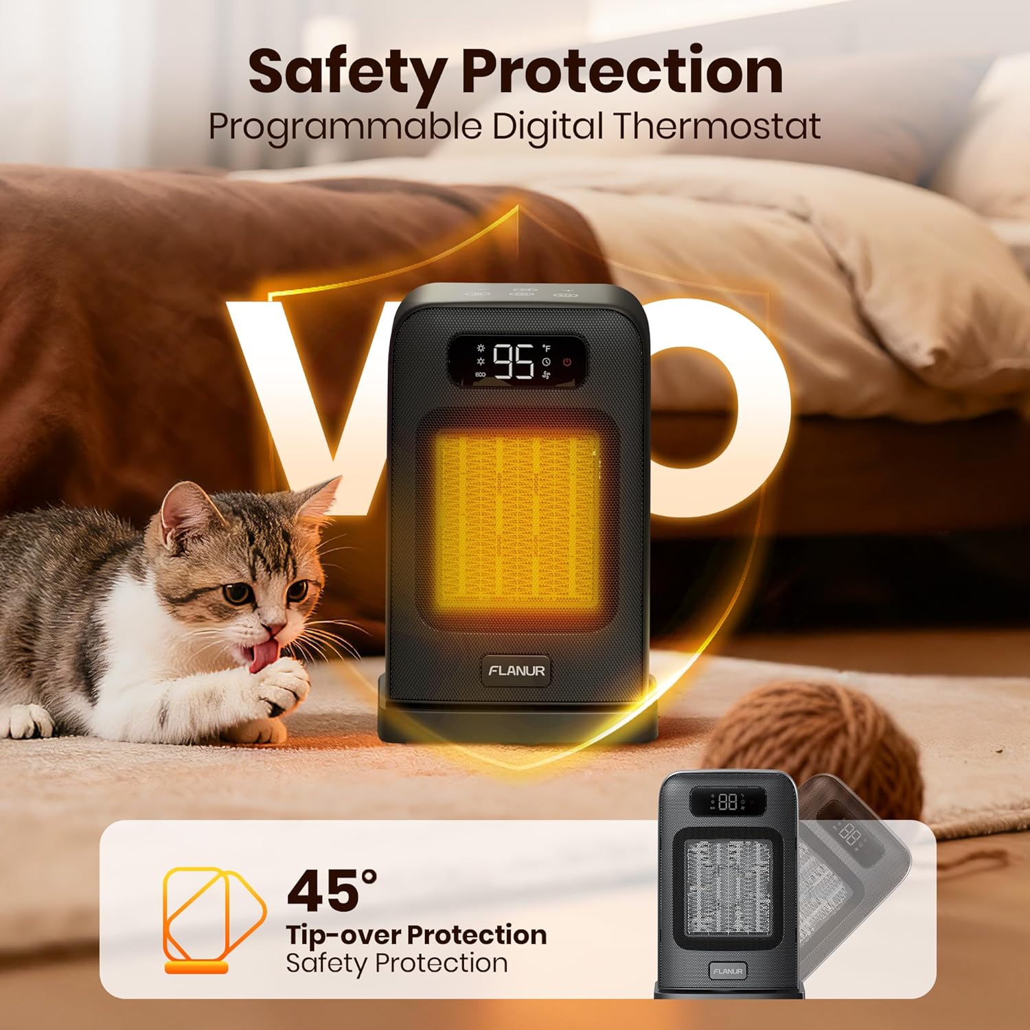 • **Uncompromising Safety for Peace of Mind:** Your safety is our top priority. This heater is equipped with multiple layers of protection. Made with V0 flame-retardant materials, it features built-in overheat protection that automatically shuts the unit off if it gets too hot, and a reliable tip-over switch that instantly powers it down if accidentally nudged. For added security, it includes a 24-hour auto shut-off and a 30-second residual heat dissipation program after use.