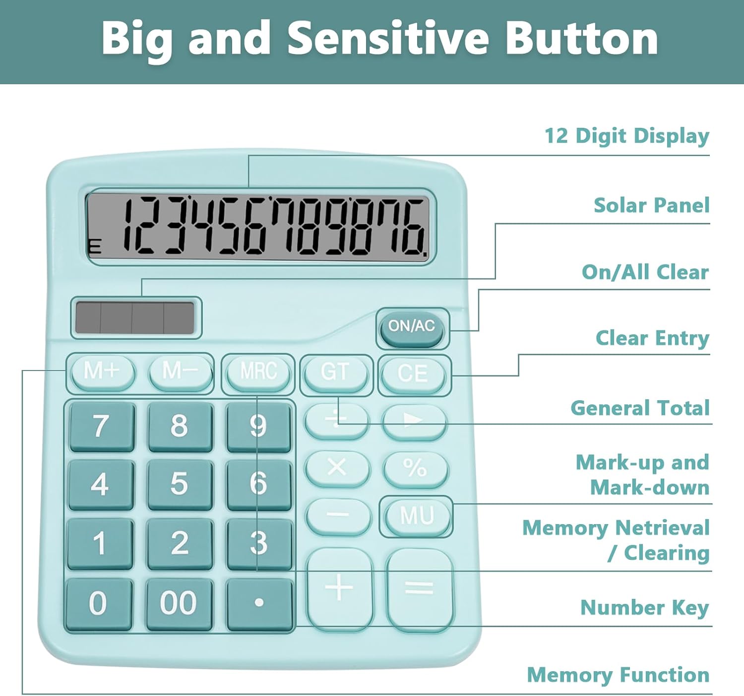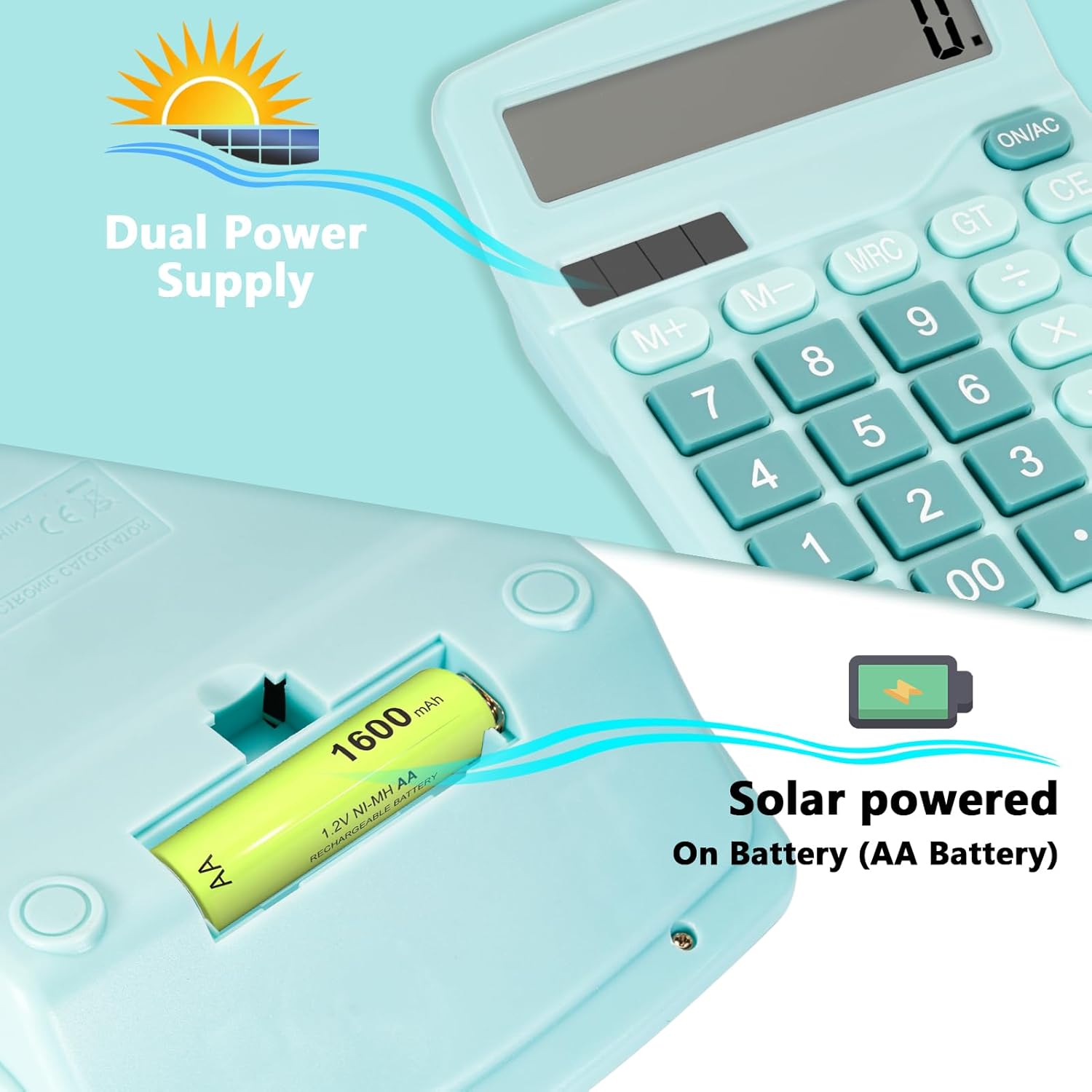 Add a touch of style to your workspace with this adorable Light Blue Desktop Calculator. Designed for both functionality and aesthetics, this calculator features a vibrant, cute light blue finish that brightens up any desk while providing robust performance for all your mathematical needs. Equipped with a clear, 12-digit large display screen, it ensures easy readability of complex calculations, making it perfect for students, teachers, and professionals alike. The responsive, big buttons are engineered for accurate input and reduce typing fatigue during long sessions of balancing checkbooks or calculating grades. versatility is key with this device; it utilizes a dual power supply system, combining solar energy for eco-friendly use and battery power (requires 1 AA battery, not included) for reliability in any lighting condition. Its slim, compact profile ensures it sits neatly on your desk without occupying valuable space. Whether you are crunching numbers at the office, helping with homework at the kitchen table, or managing a small business, this cute calculator blends reliable performance with charming design.
