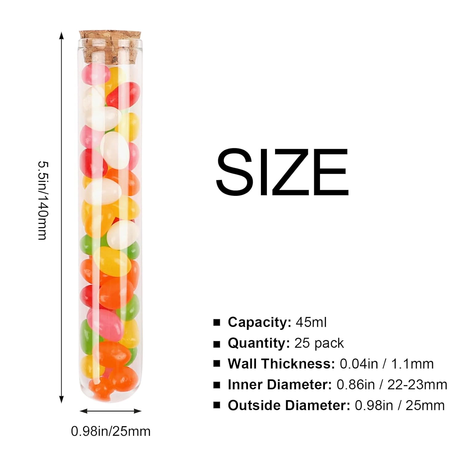 - SECURE CORK STOPPERS: Each 25x140mm tube includes a tight-sealing natural cork to keep samples, spices, or candies fresh and spill-free.