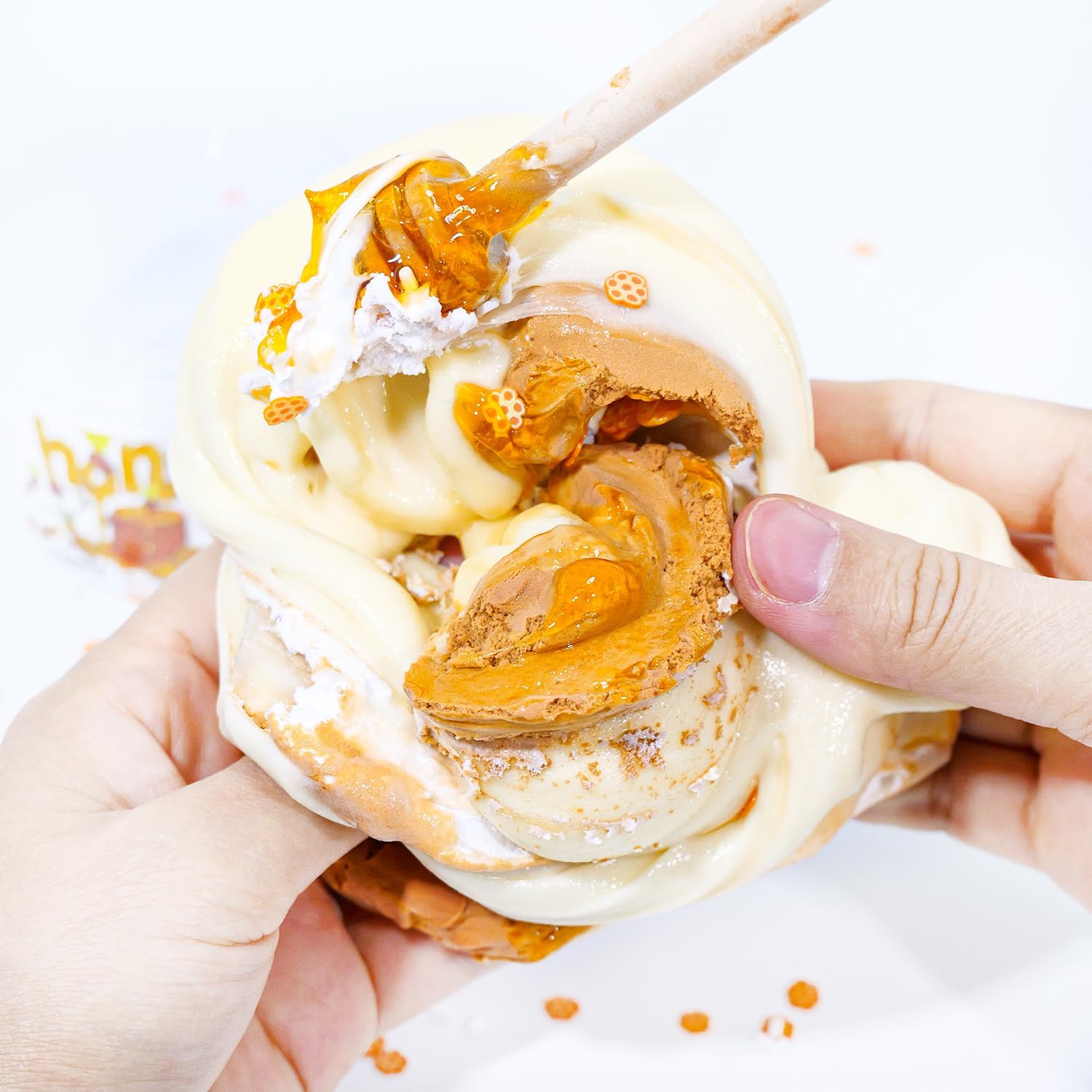 Start your sensory journey with our signature thick and glossy base. As you knead the included honeycomb pieces into the slime, watch the texture magically transform. The result is a pillowy-soft, fluffy cloud that is incredibly satisfying to stretch, poke, and pull.