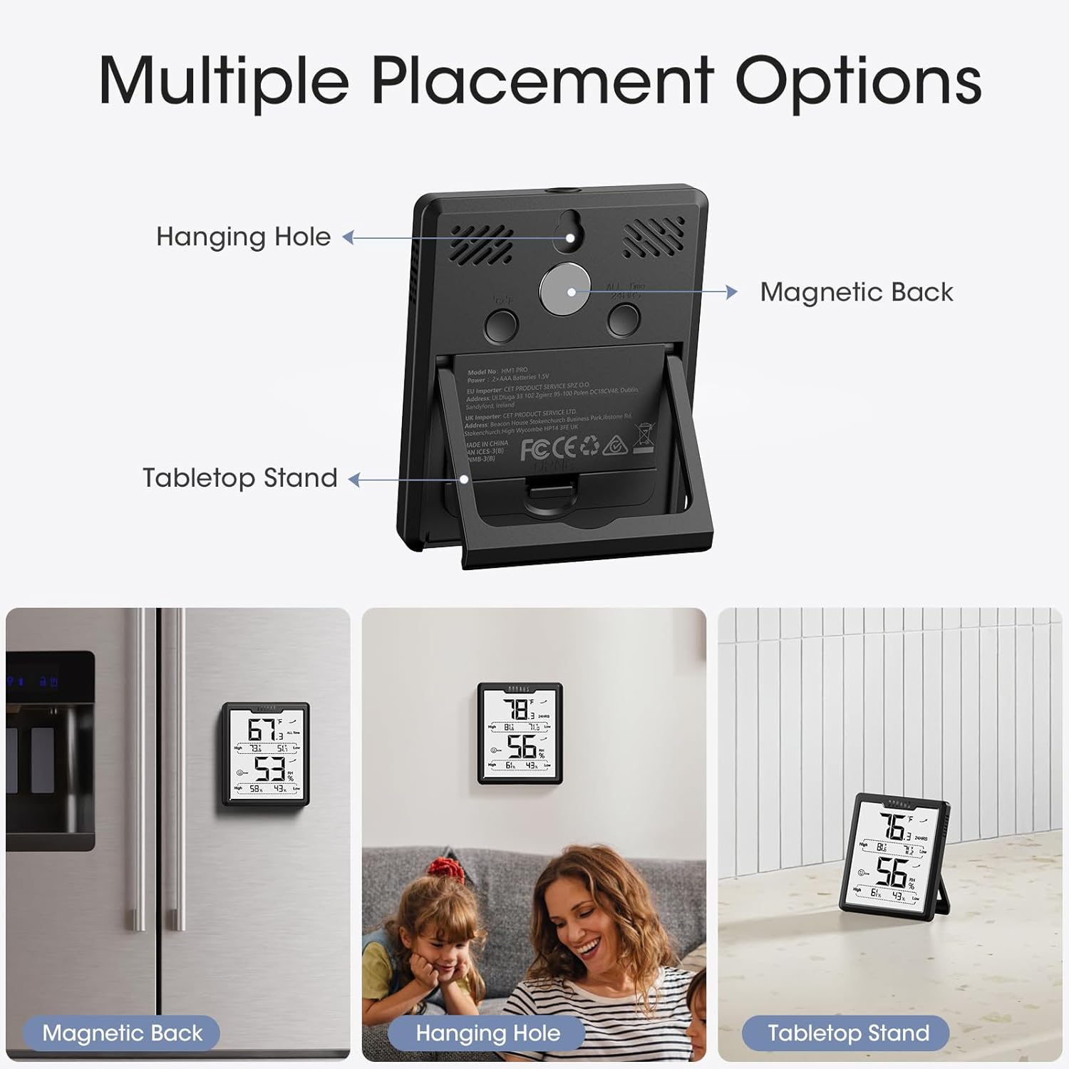 This digital thermometer goes beyond basic numbers; it includes a helpful Air Comfort Indicator. Utilizing three distinct face icons (DRY, COMFORT, WET), it instantly alerts you to the air quality, prompting you to adjust your humidifier or dehumidifier to maintain the perfect atmosphere. Versatility meets convenience with multiple mounting options, including a magnetic back, a hanging hole, and a flip-out tabletop stand, making it suitable for nurseries, greenhouses, cigar humidors, and basements.