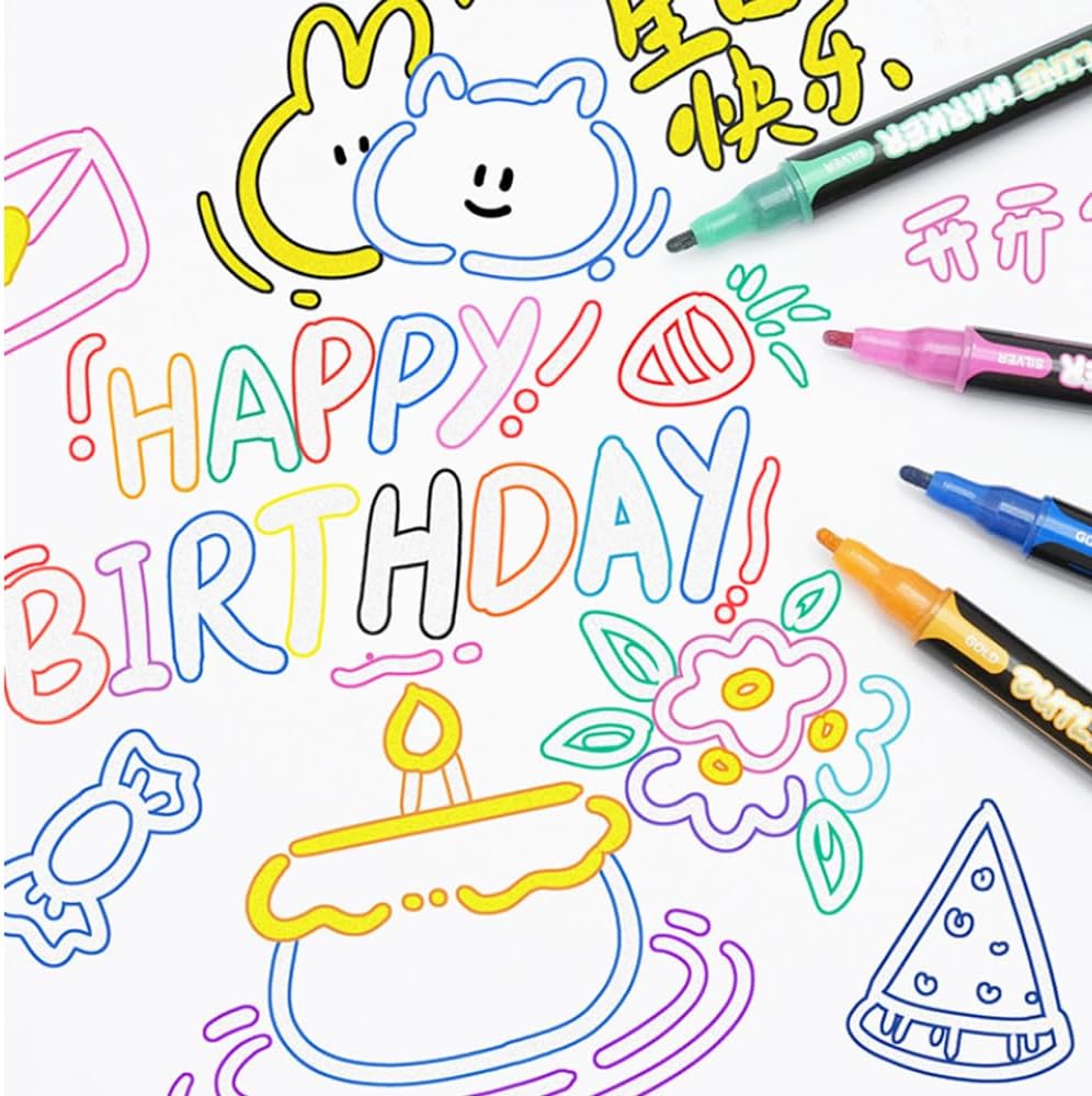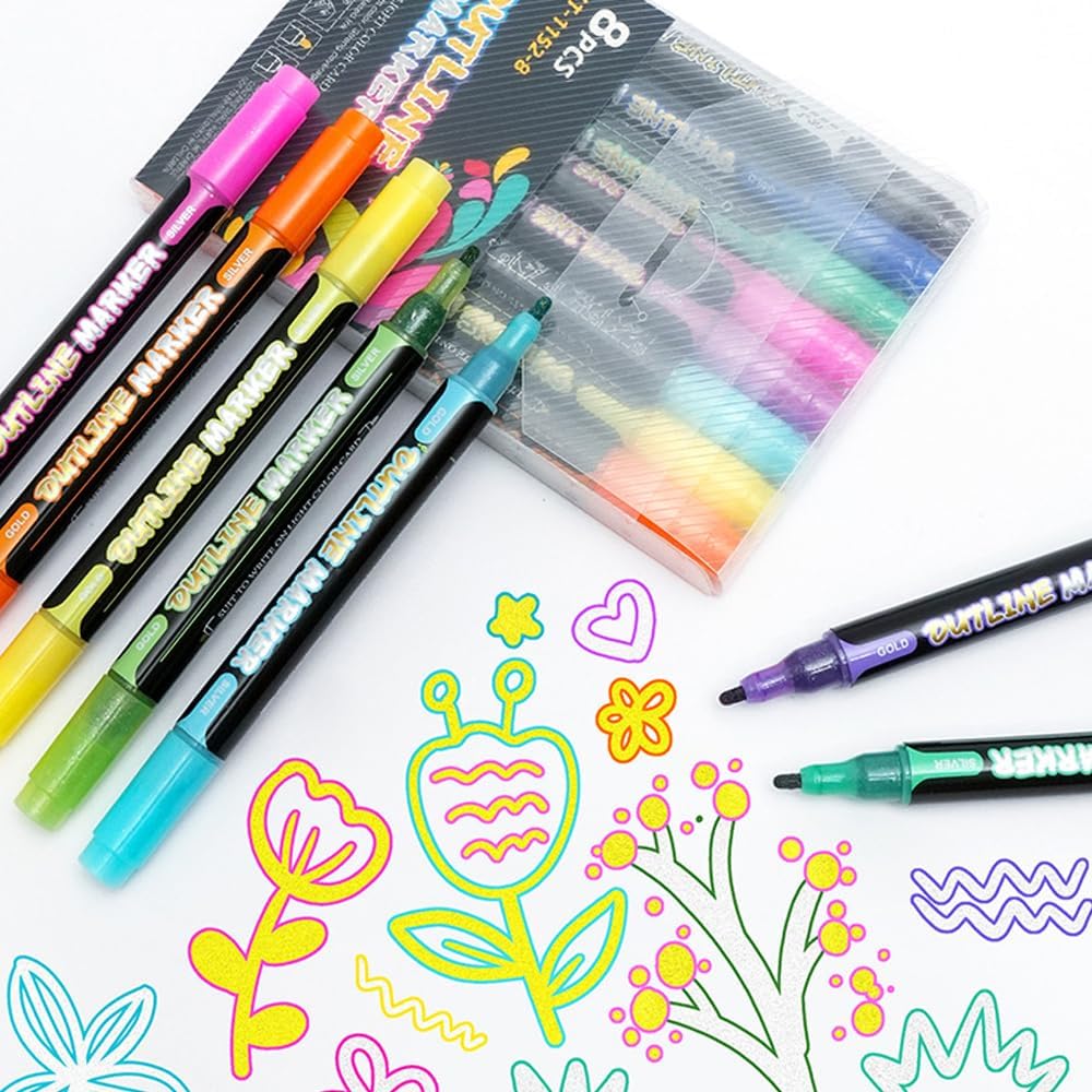 Elevate your artwork with our premium Double Line Outline Markers. This innovative 12-piece set features a unique specialized tip that lays down a colorful glitter core surrounded by a crisp metallic outline, allowing you to create stunning 3D-style lettering and designs with a single stroke. Perfect for adding shimmering elegance to greeting cards, scrapbooks, bullet journals, and DIY projects, the water-based ink flows smoothly and dries quickly to prevent smudging. Whether you are a professional artist or a beginner, these pens offer an effortless way to add bold, holographic effects to your creations.
