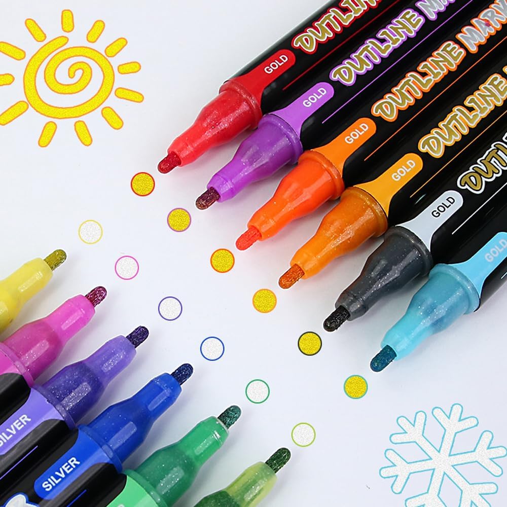 Double Line Outline Markers – 12Pc Metallic Glitter Gel Pens for Coloring, Journals & DIY Crafts