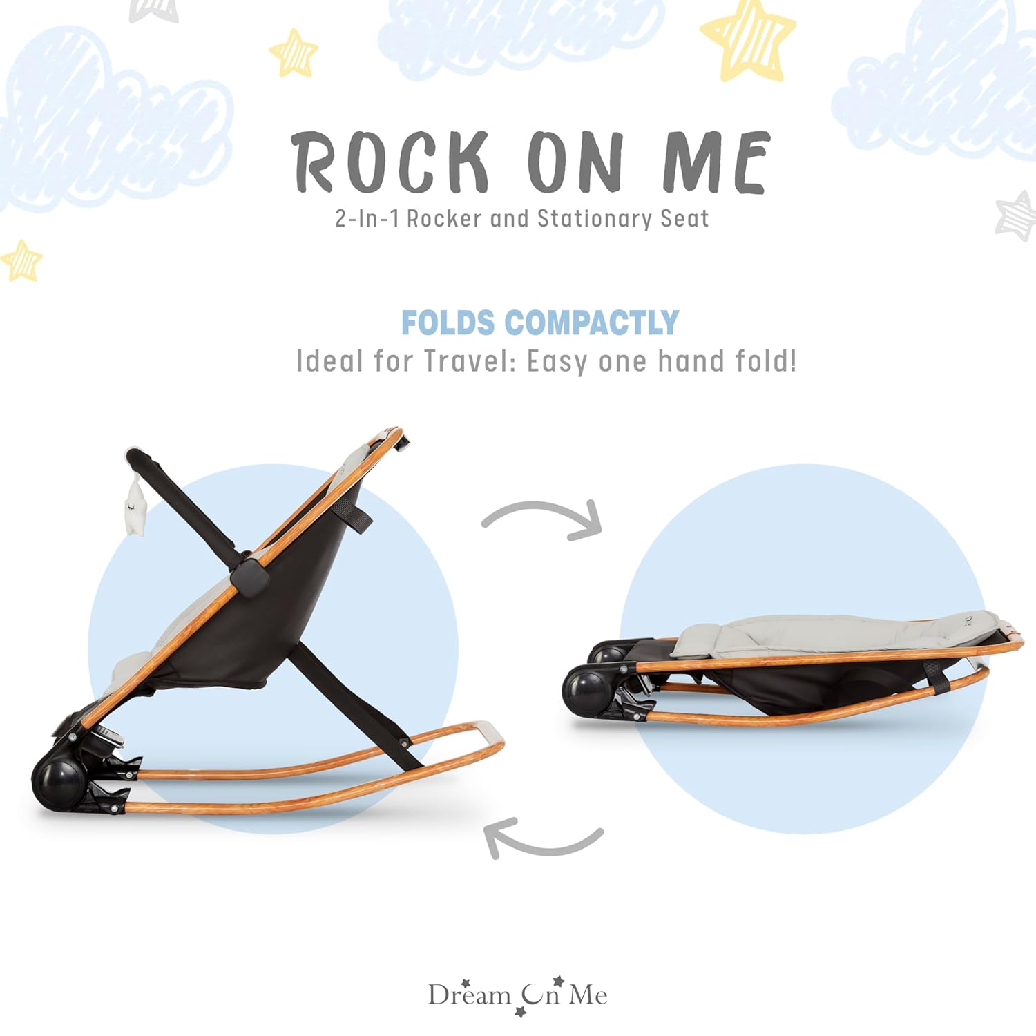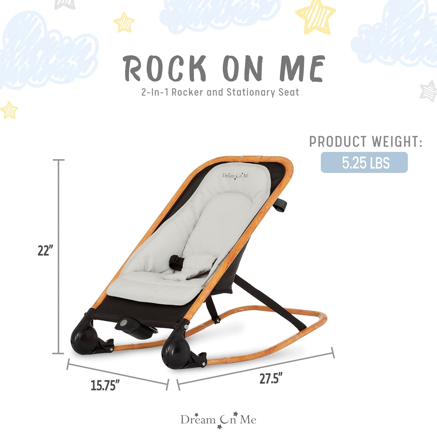 Soothe and entertain your little one with the Dream On Me Rock On Me 2-in-1 Baby Rocker. Featuring gentle vibrations, calming music, and an adjustable recline, this cozy seat keeps baby comfortable and secure with a 3-point harness. Includes a detachable toy bar for playtime and folds flat for easy travel and storage. Stylish Black & Grey finish.