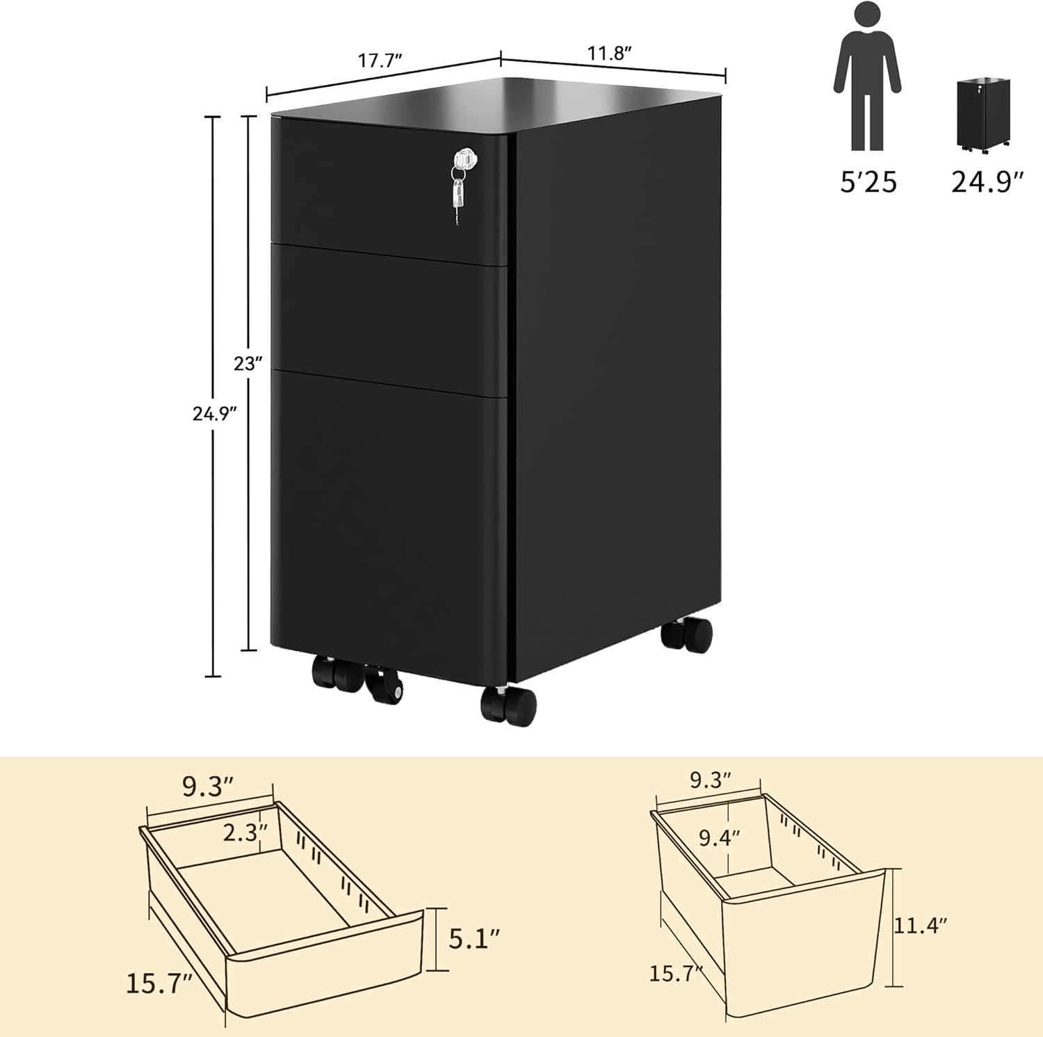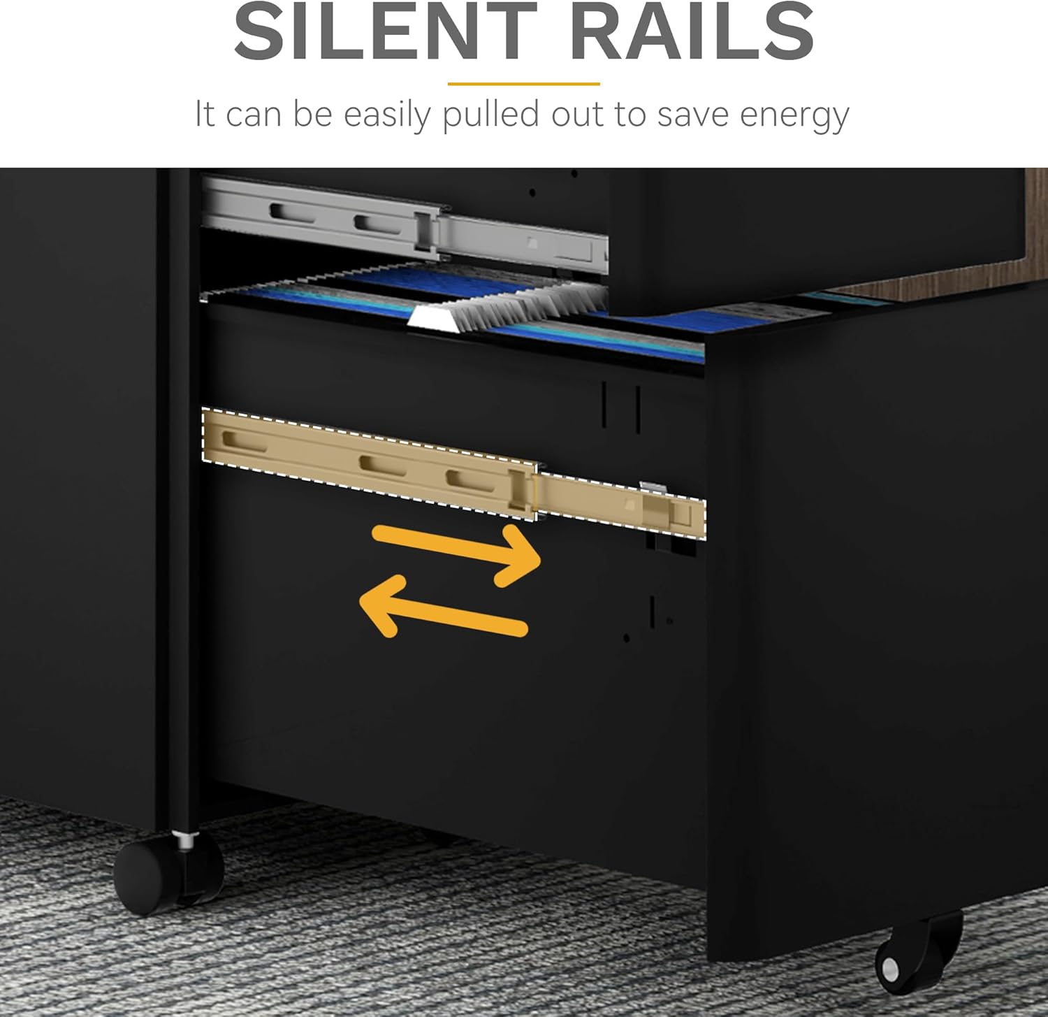 Experience whisper-quiet operation with high-performance sliding rails that ensure drawers open and close smoothly without disturbing your focus. Security is paramount; the integrated locking system secures all three drawers, safeguarding sensitive documents and personal items. Mobility is effortless thanks to the five-wheel system, which includes four swivel casters (two with brakes) and a central anti-tip caster for stability during movement. Whether you need to slide it under your desk or move it across the room, this cabinet offers 360-degree maneuverability.