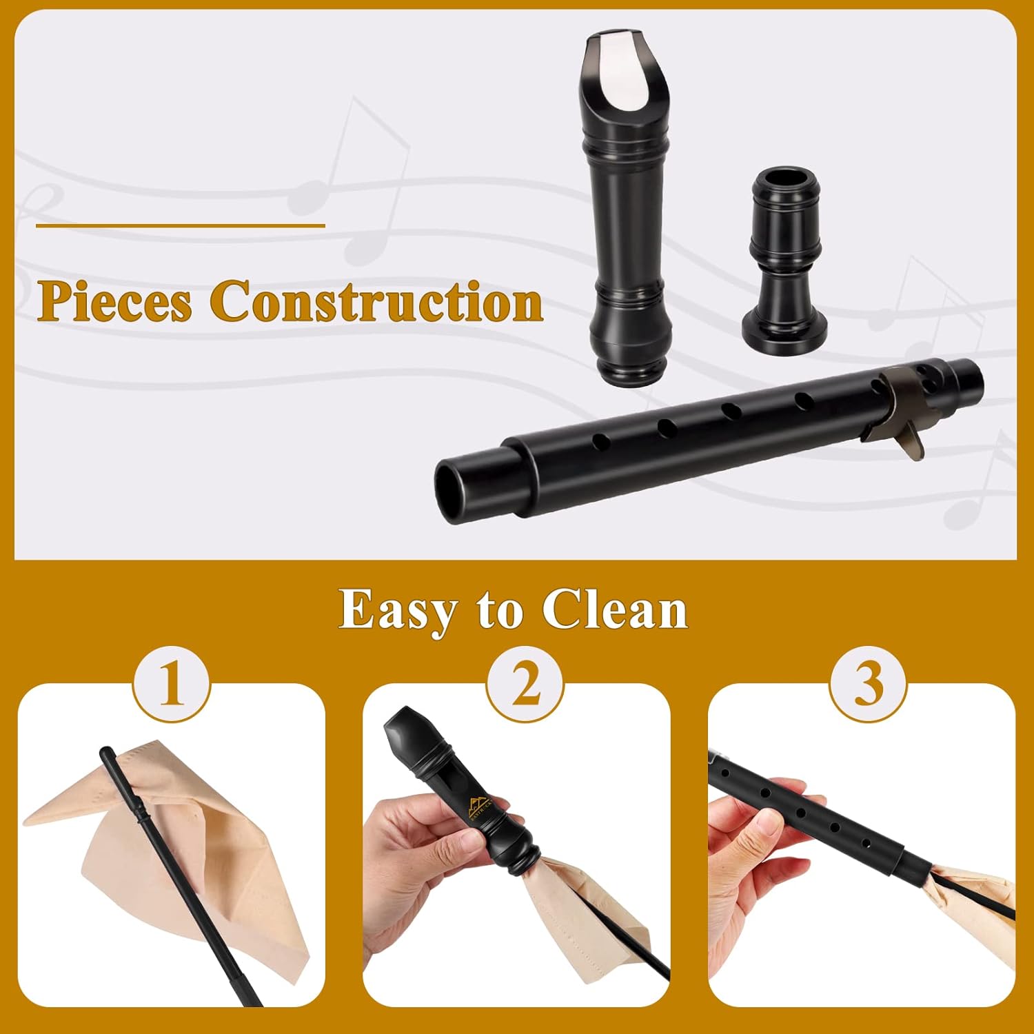 Eastrock Soprano Recorder – German Style C Key 3-Piece ABS Instrument with Cleaning Rod, Fingering Chart, Carrying Bag, and Thumb Rest – Ideal for Students, Classroom, and Band (Black)