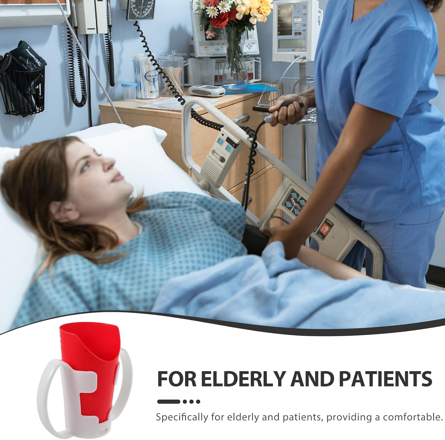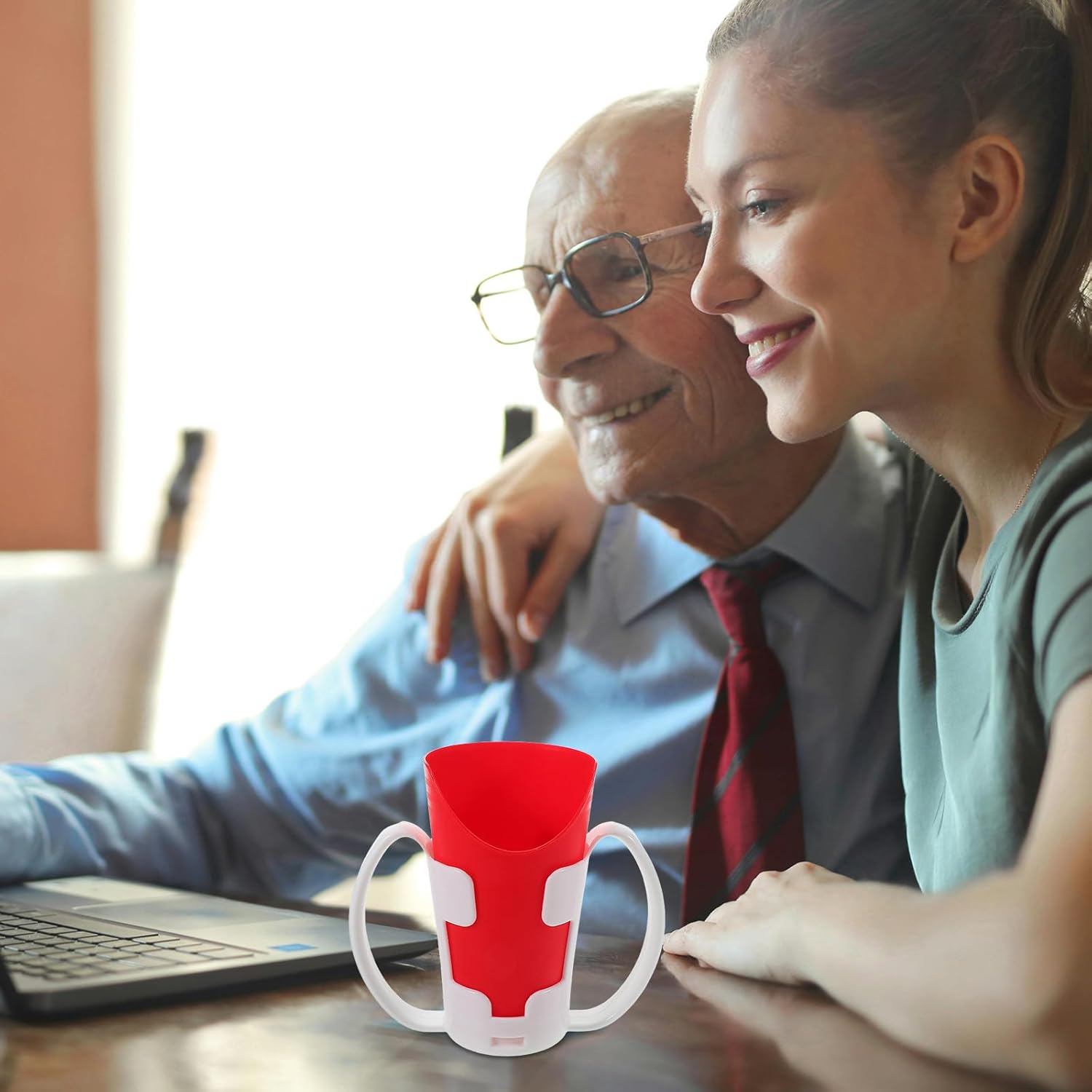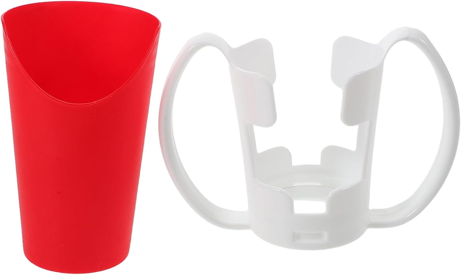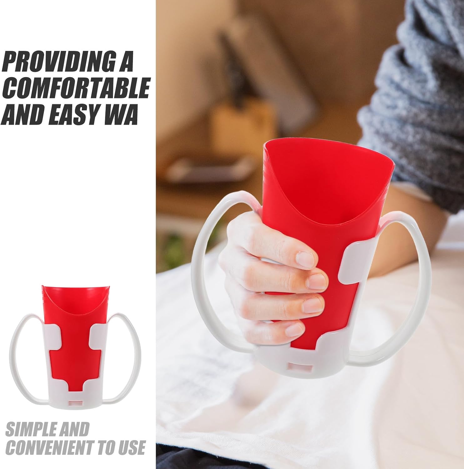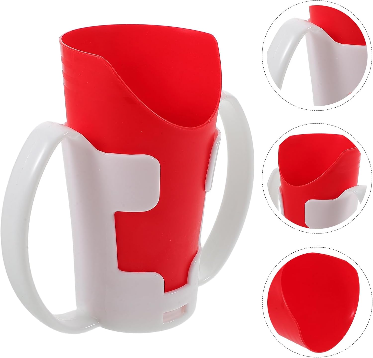 U-shaped nosey cup with handle for easy drinking without head tilt. Includes detachable grip sleeve and red stand. Dishwasher safe. Ideal for seniors, stroke patients, and those with limited mobility.