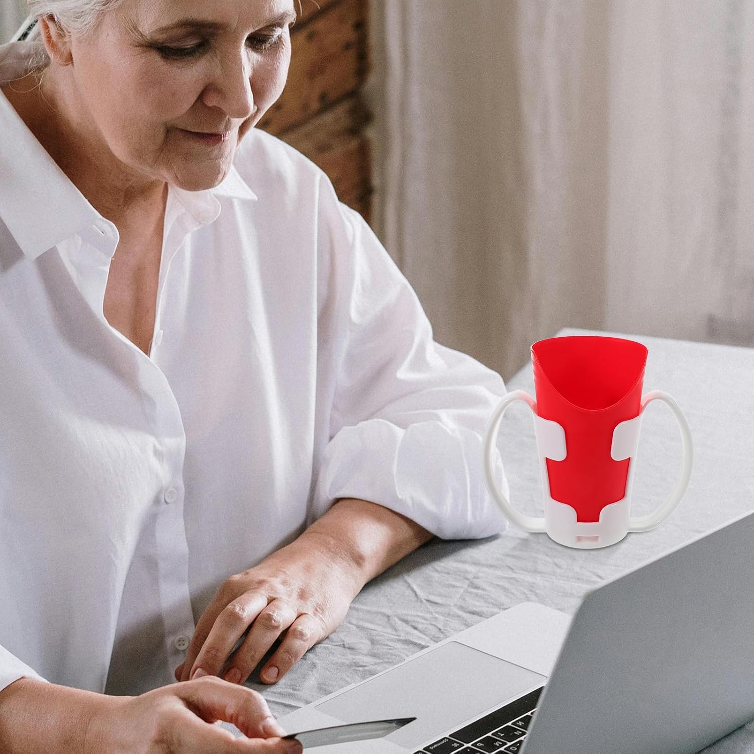 The EasyDrink Pro is a thoughtfully designed adaptive drinking cup engineered specifically for seniors, post-stroke patients, and individuals with limited neck mobility or swallowing difficulties. Featuring an innovative U-shaped cutout design, this nosey cup allows users to drink comfortably without tilting their head backward, making hydration safe and effortless. The ergonomic handle provides a secure grip for those with weak hands or limited dexterity, while the included detachable cup holder sleeve adds an extra layer of stability. Constructed from durable, BPA-free PP material, this therapy cup is dishwasher safe for easy cleaning and built to withstand daily use. The included red stand keeps the cup upright and within reach, preventing spills and promoting independence. Perfect for rehabilitation settings, senior care, or home use – this adaptive cup helps restore dignity and confidence during daily hydration. Whether recovering from surgery, managing arthritis, or dealing with Parkinson’s disease, the EasyDrink Pro drinking aid supports your independence with every sip.