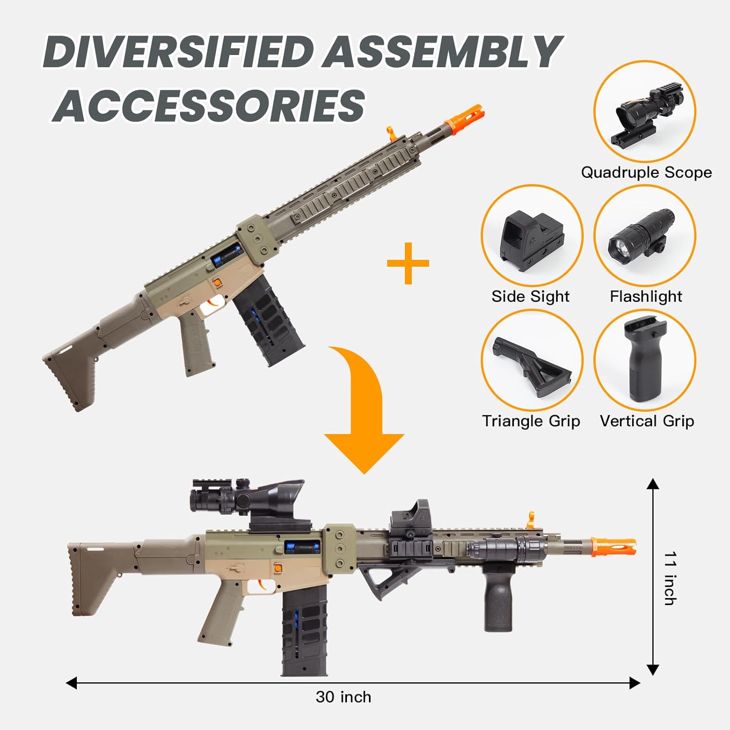 • Customizable Design: Realistic 30-inch rifle assembly with adjustable sights and ergonomic foregrips for precision handling.