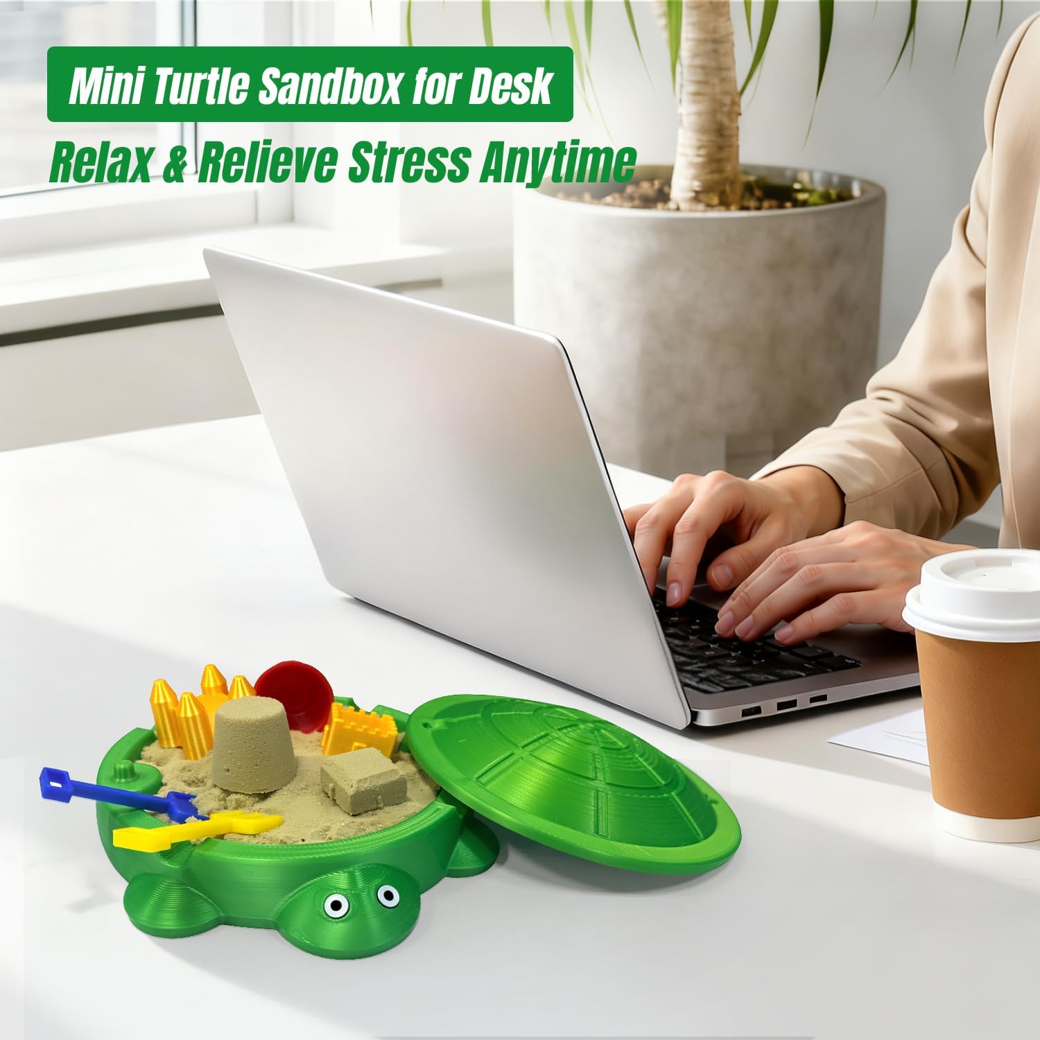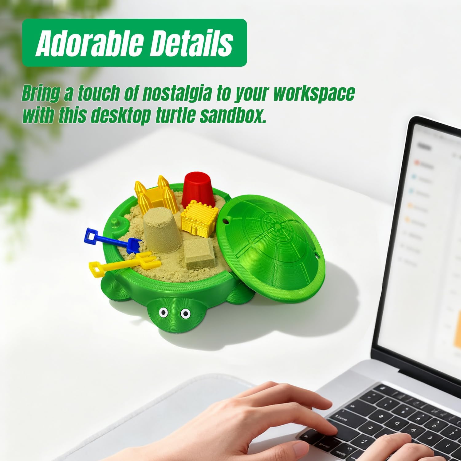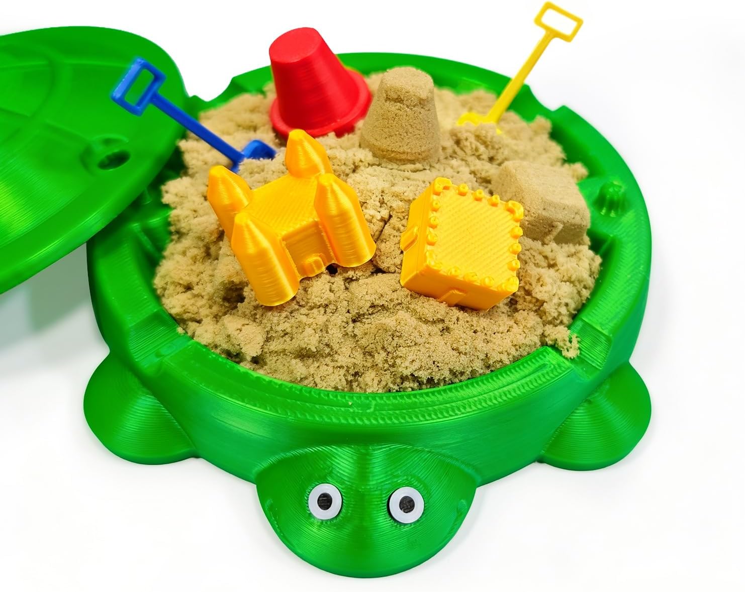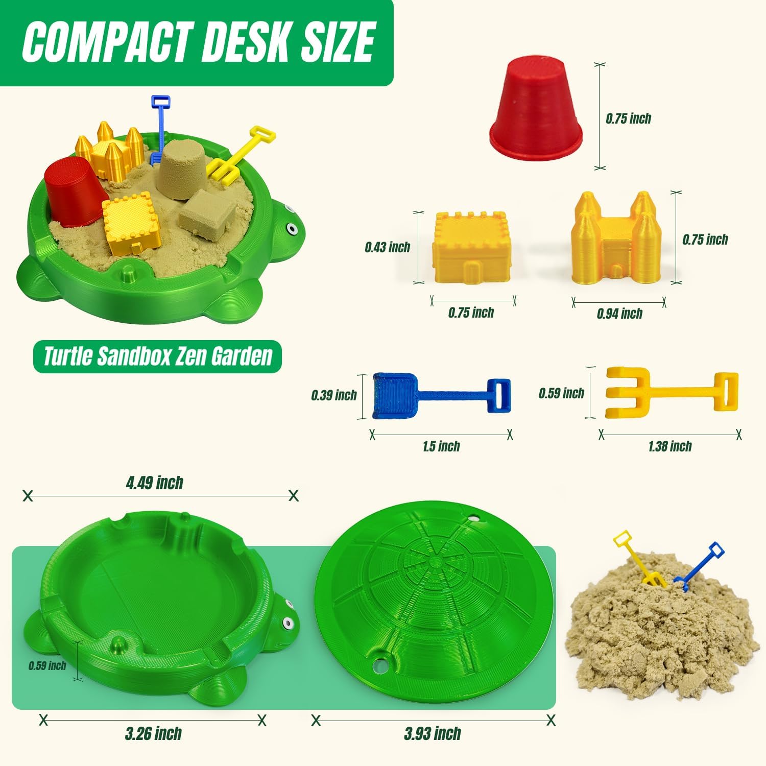 Sturdy & Portable Design: Crafted from durable, lightweight plastic with a smooth finish, this turtle sandbox is built for daily use. Its compact dimensions (approx. 4.6″ L x 3.85″ W) make it the perfect size for desks, shelves, or small tables. It is large enough for creative play yet small enough to stay out of the way.
