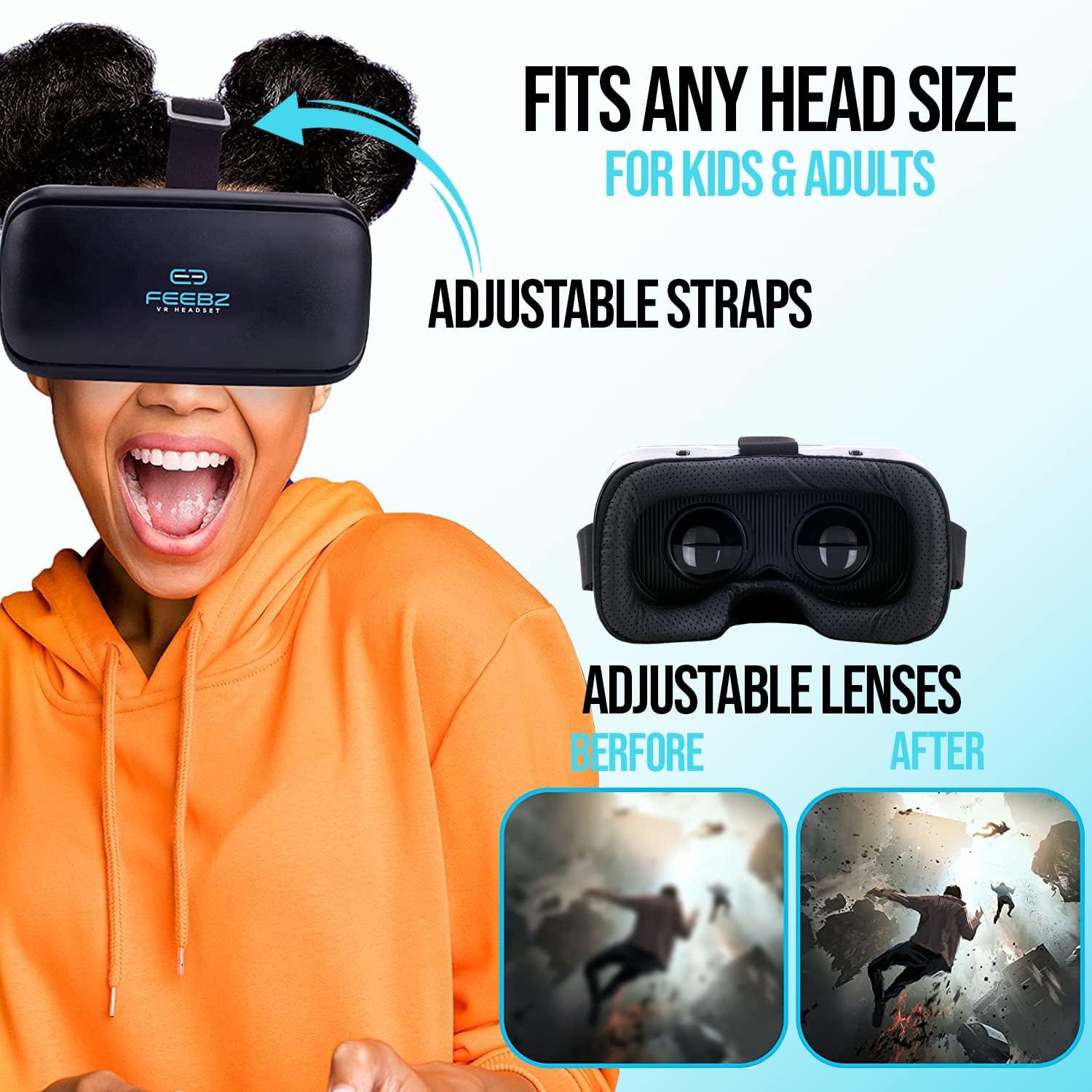 Understanding the needs of younger users, the FEEBZ 2.0 features adjustable straps and a comfortable face plate that accommodates a wide range of head sizes (recommended for kids 8+ and adults). The lightweight design ensures extended play sessions without discomfort.