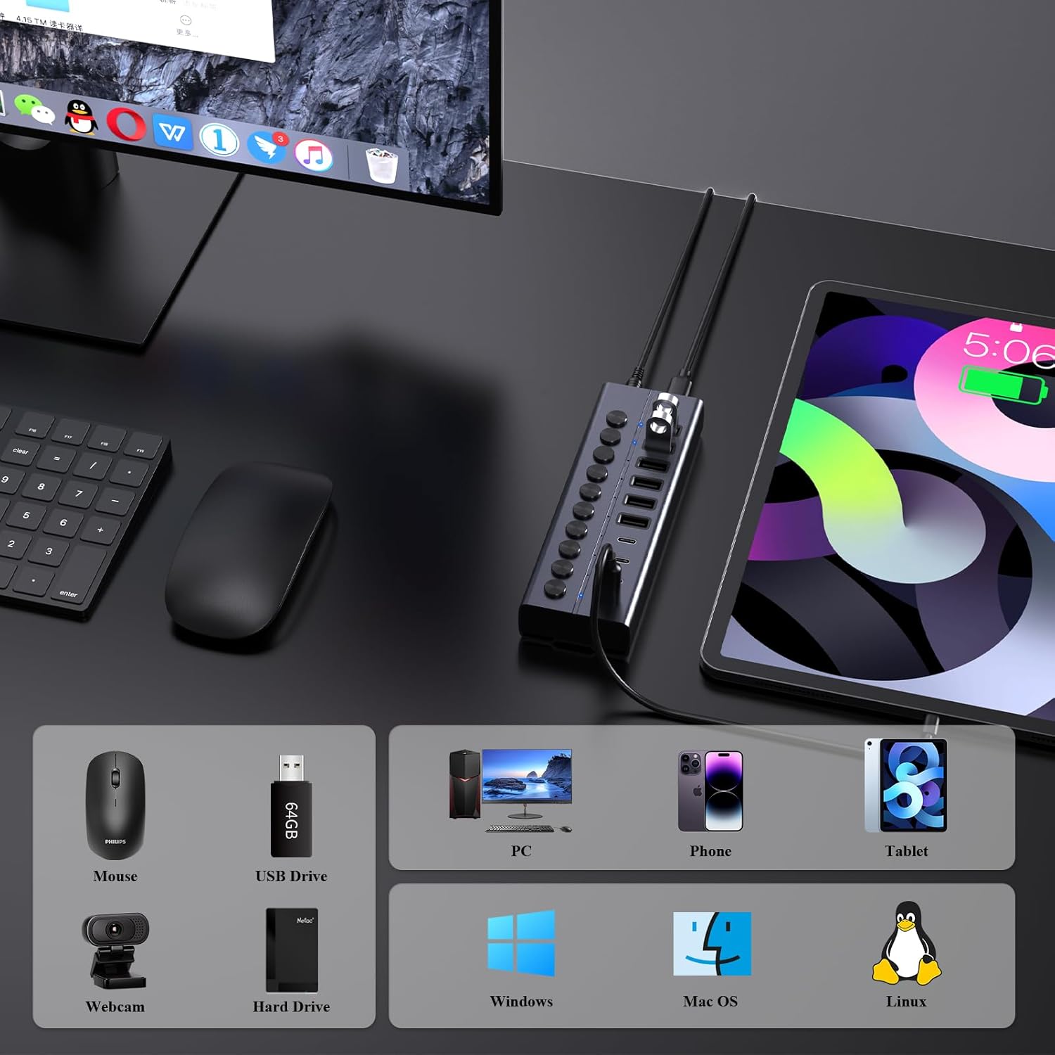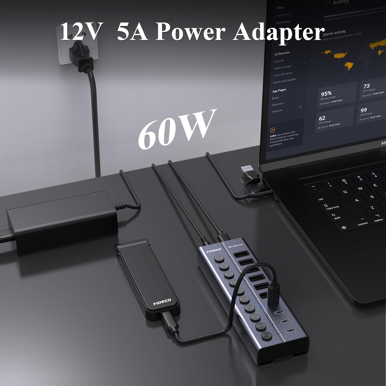 - 60W Powered Hub: Includes a 12V/5A power adapter to support high-power devices and ensure stable connectivity for all your accessories.
