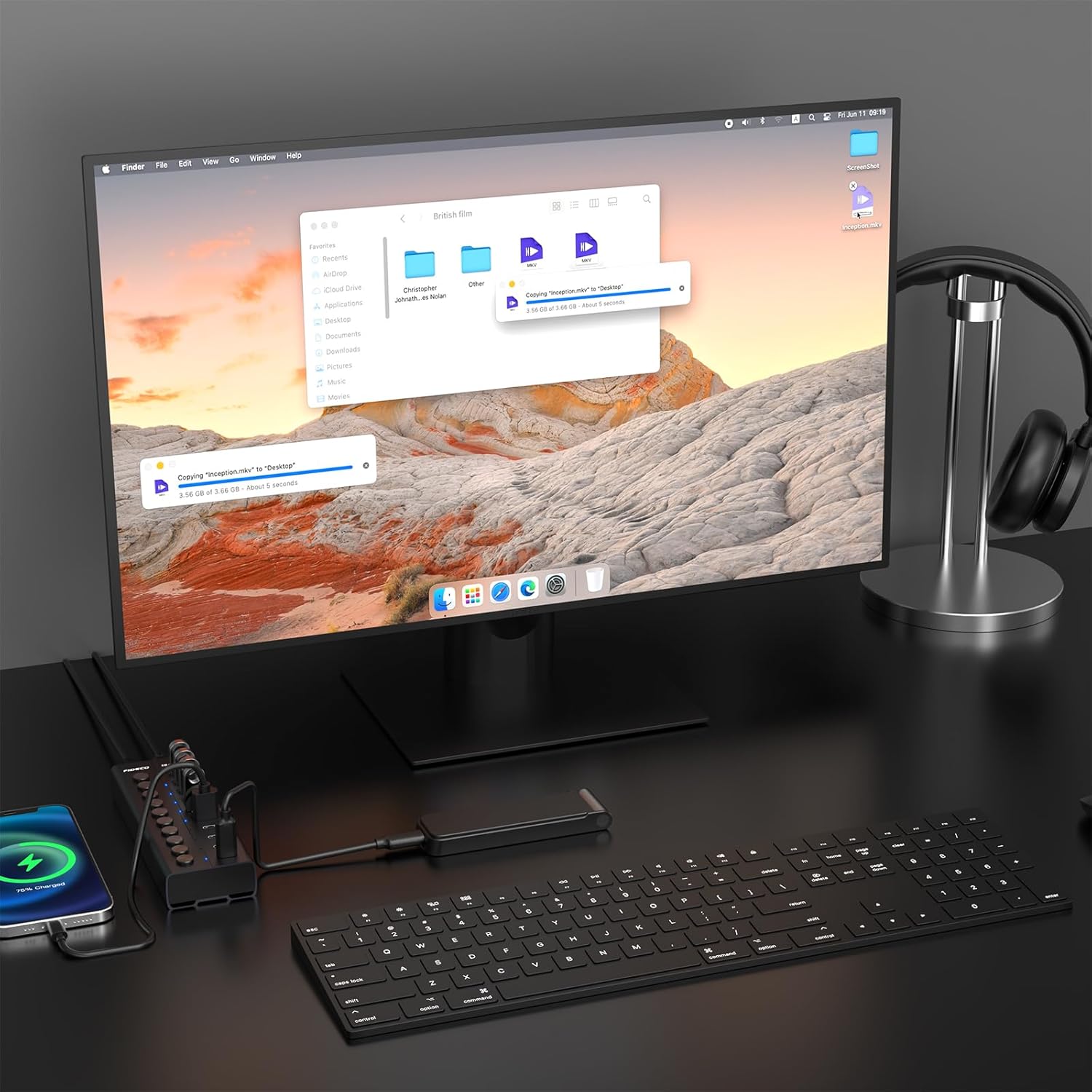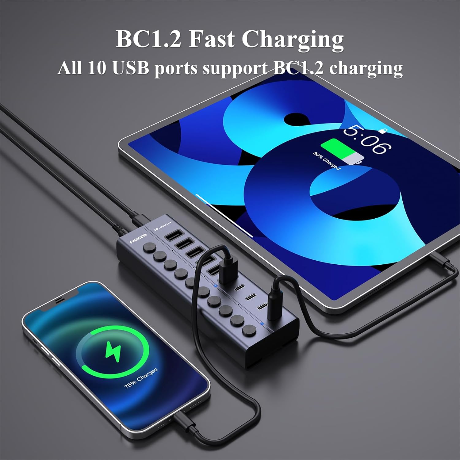 Don’t let a low-power hub slow you down. The FIDECO hub comes equipped with a robust 12V/5A power adapter providing up to 60W of power. This ensures that power-hungry devices like external hard drives and gaming receivers receive stable current. Additionally, the hub supports BC 1.2 charging up to 5V/1.5A, allowing you to charge your smartphones and tablets directly from the hub while transferring data.