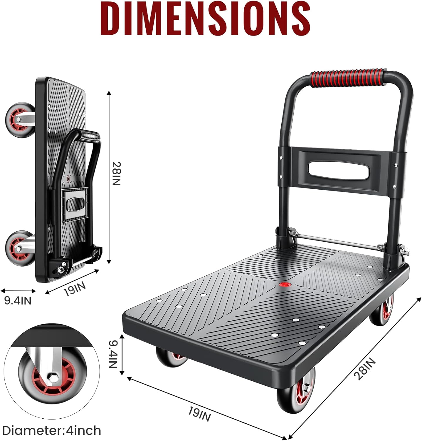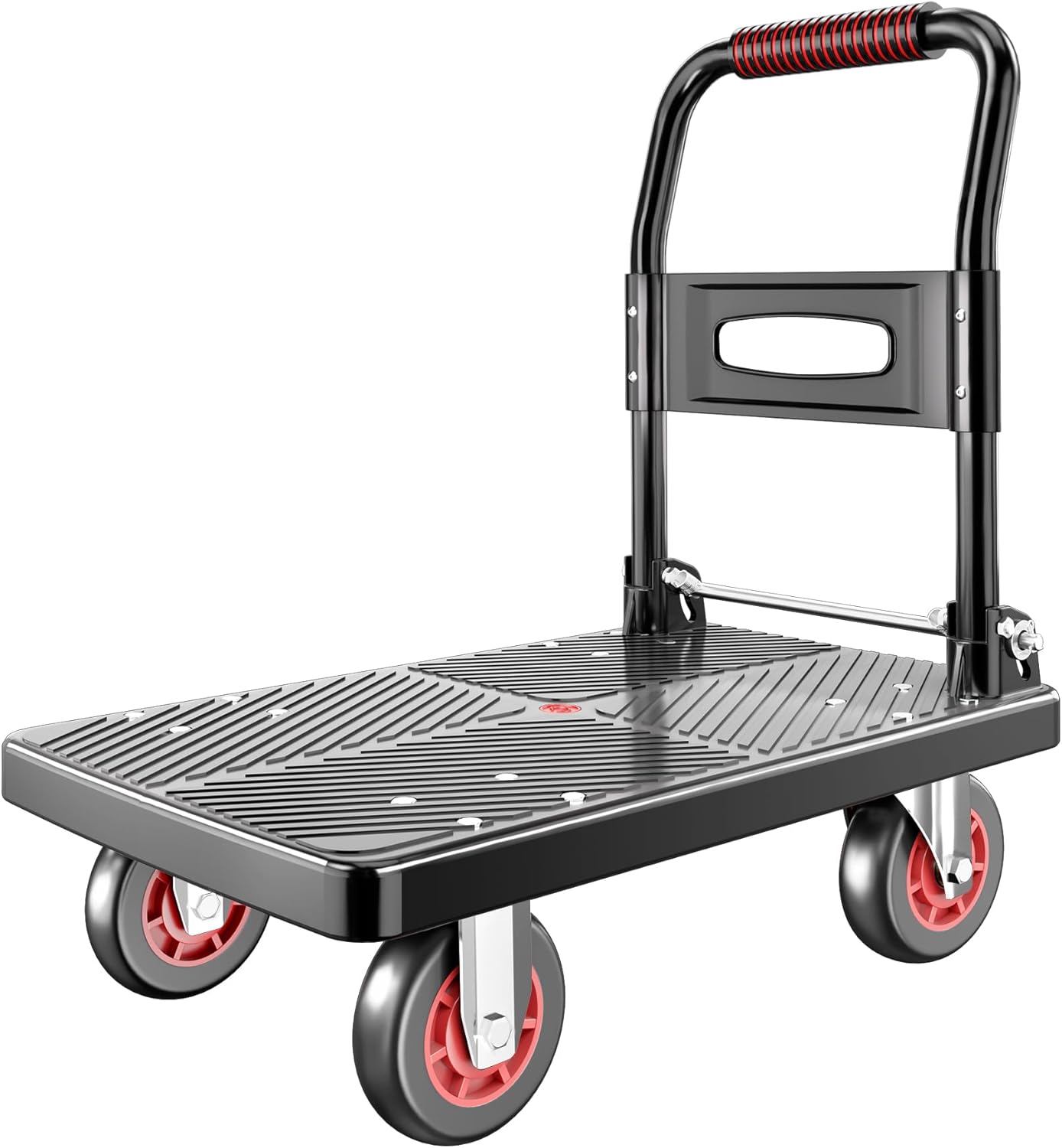 Versatile Material Handling: From moving household items and plywood to hauling garden supplies or luggage, this wheeled flatbed cart is up for the task. The non-slip platform surface keeps your cargo secure during transit, making it an essential tool for efficient material transport.