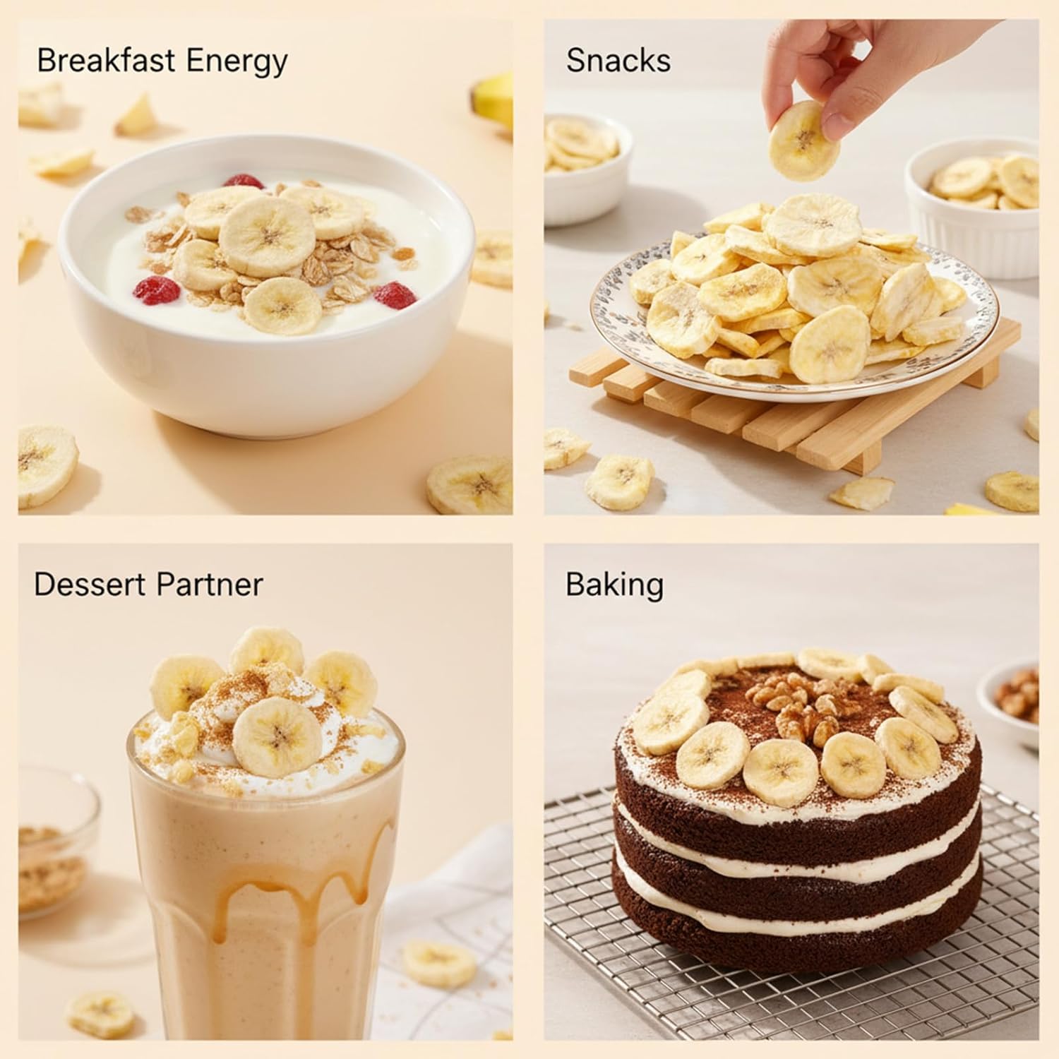 • 100% Pure Bananas: We use only the finest fresh bananas, sliced and frozen rapidly at -35°C to preserve nutrients and natural aroma.