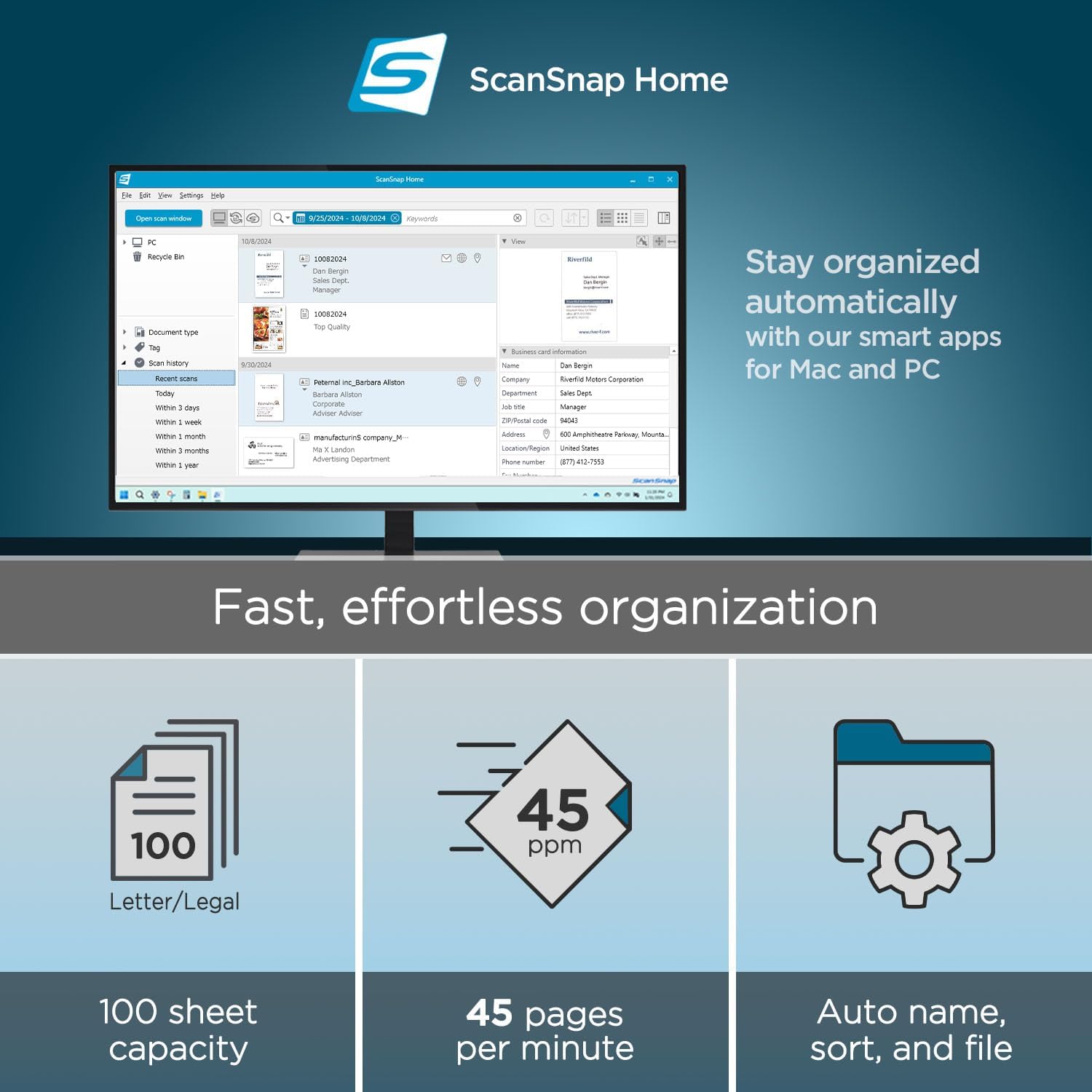 - Blazing Fast Performance: Scan double-sided documents at speeds up to 45 sheets/90 images per minute. The rapid 100-page ADF allows you to convert entire filing cabinets into searchable digital files in minutes, not hours.