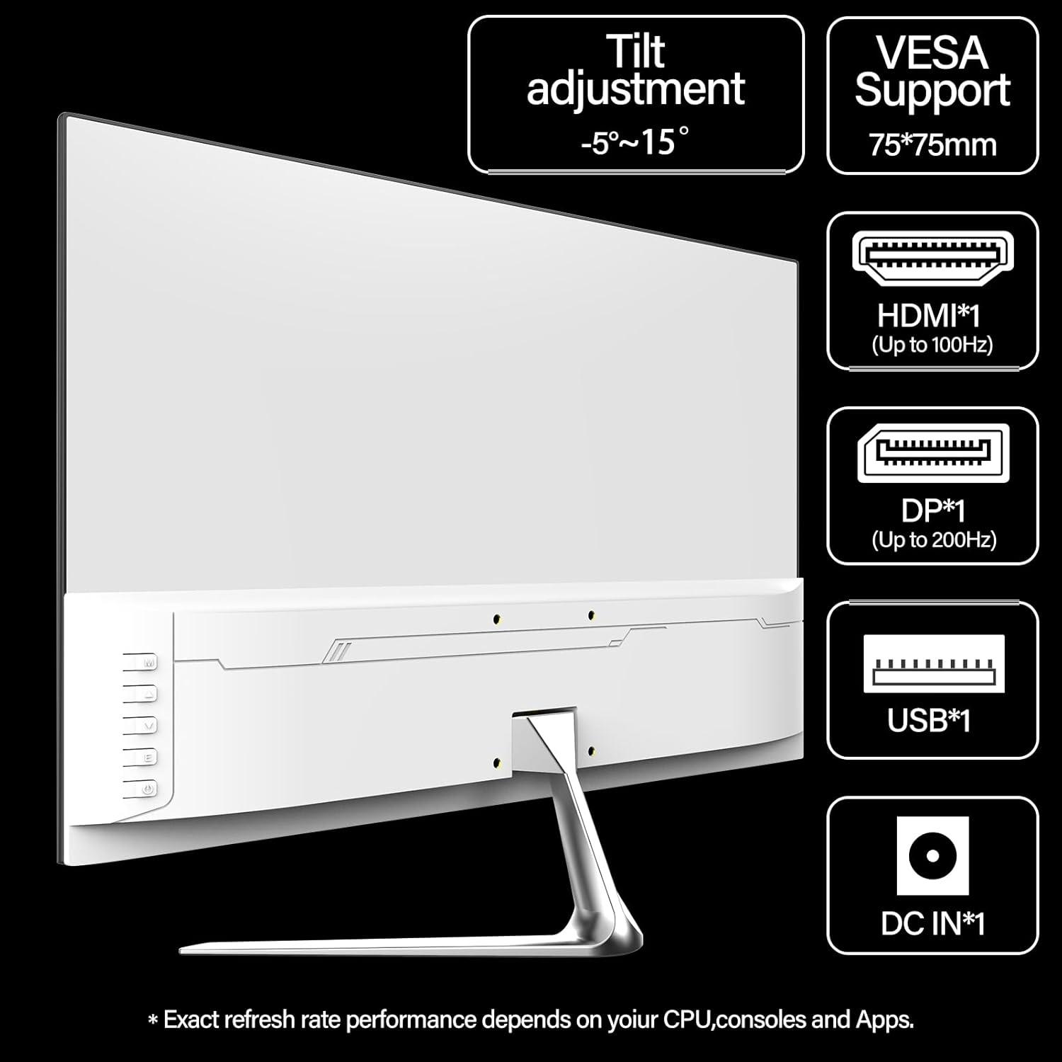 • Sleek Design: Modern white aesthetic with a frameless screen and tilt-adjustable stand, VESA mount compatible (75x75mm).