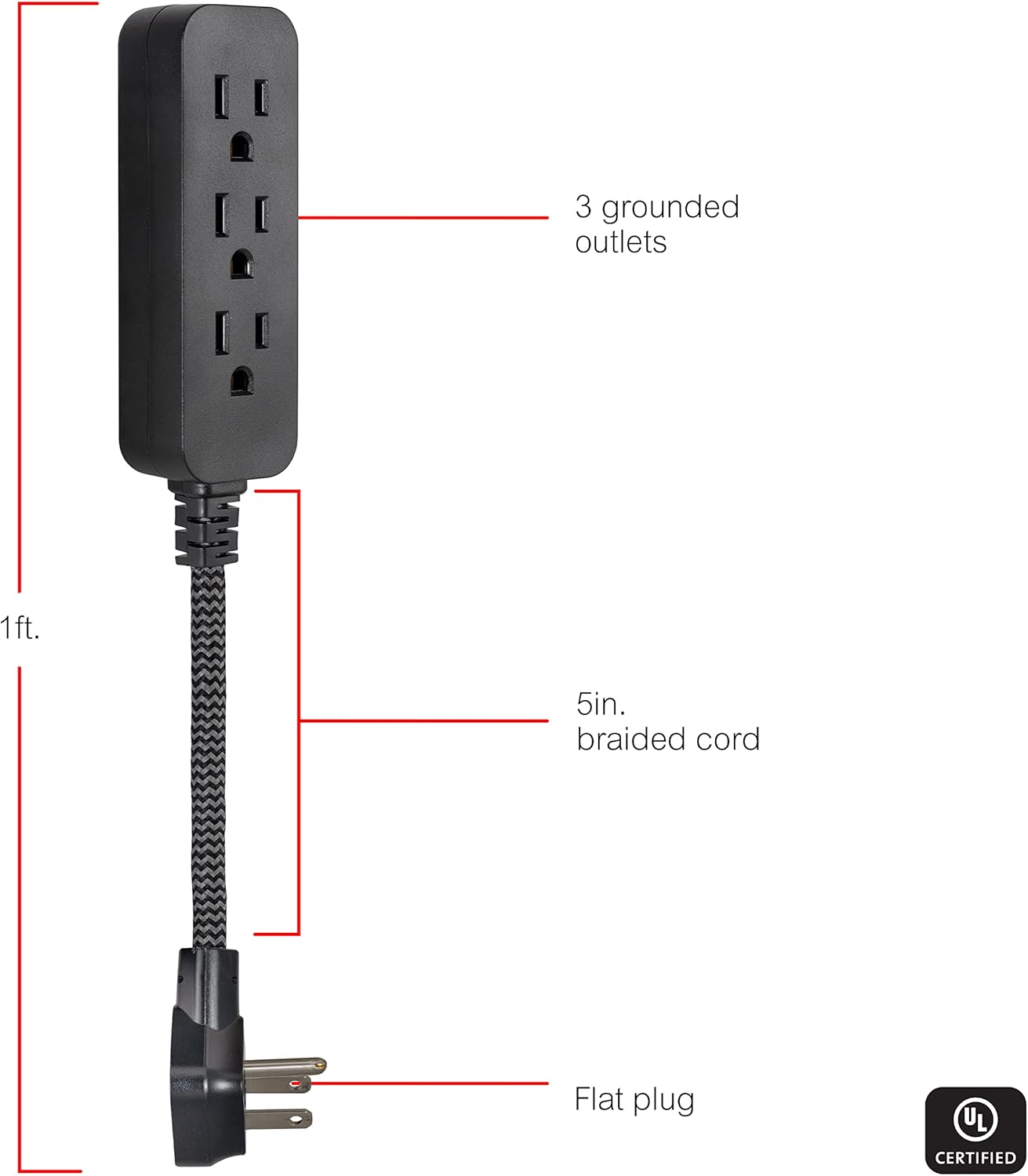 - COMPACT & FLAT PLUG: The 1-foot cord with a low-profile flat plug is designed to fit seamlessly behind sofas, desks, and other furniture without blocking extra outlets.