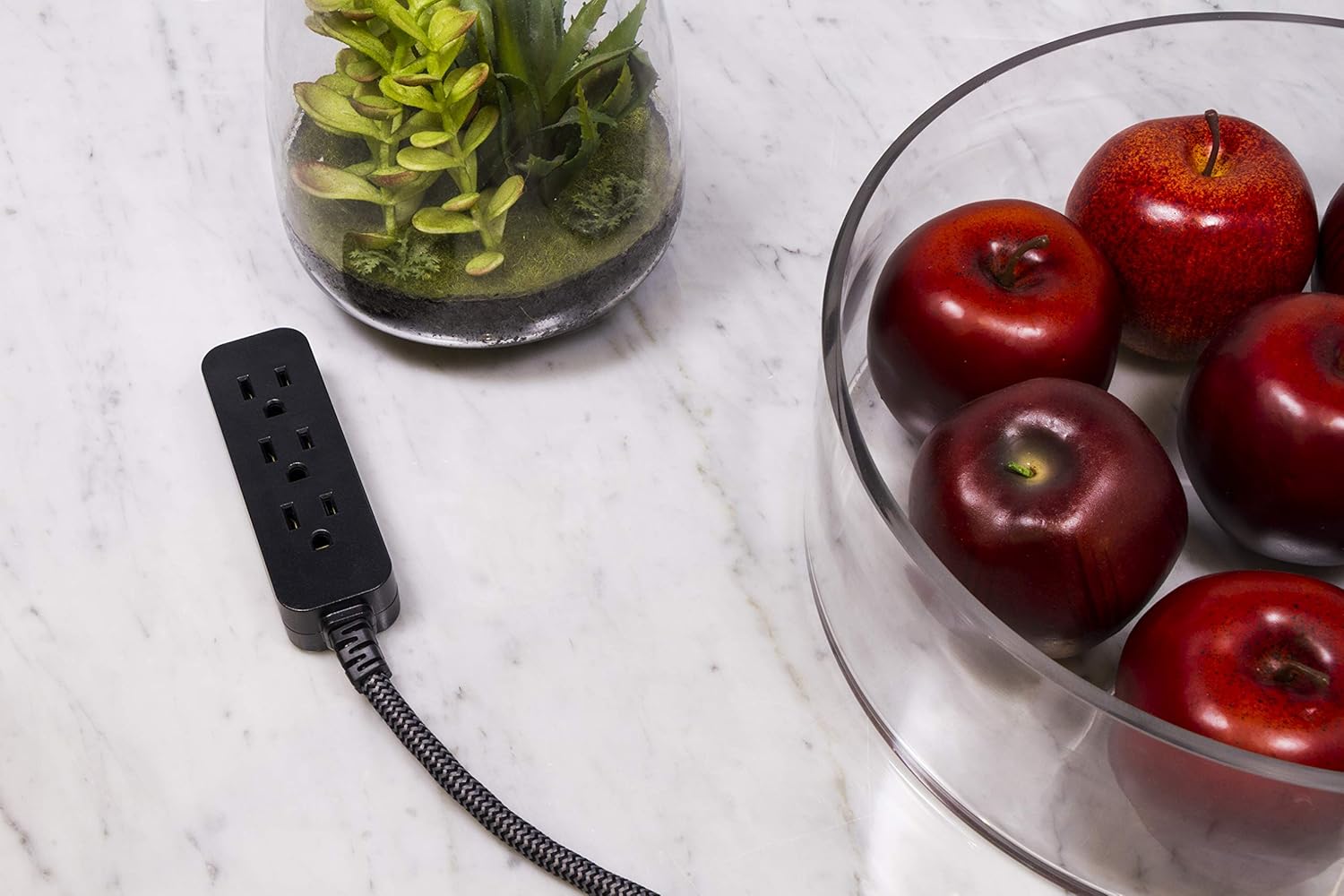 GE Designer 3-Outlet Power Strip with 1 Ft Braided Extension Cord, Flat Plug & Tangle-Resistant Fabric – Indoor Mini Cord for Home Office & Entertainment (Black, 45191)