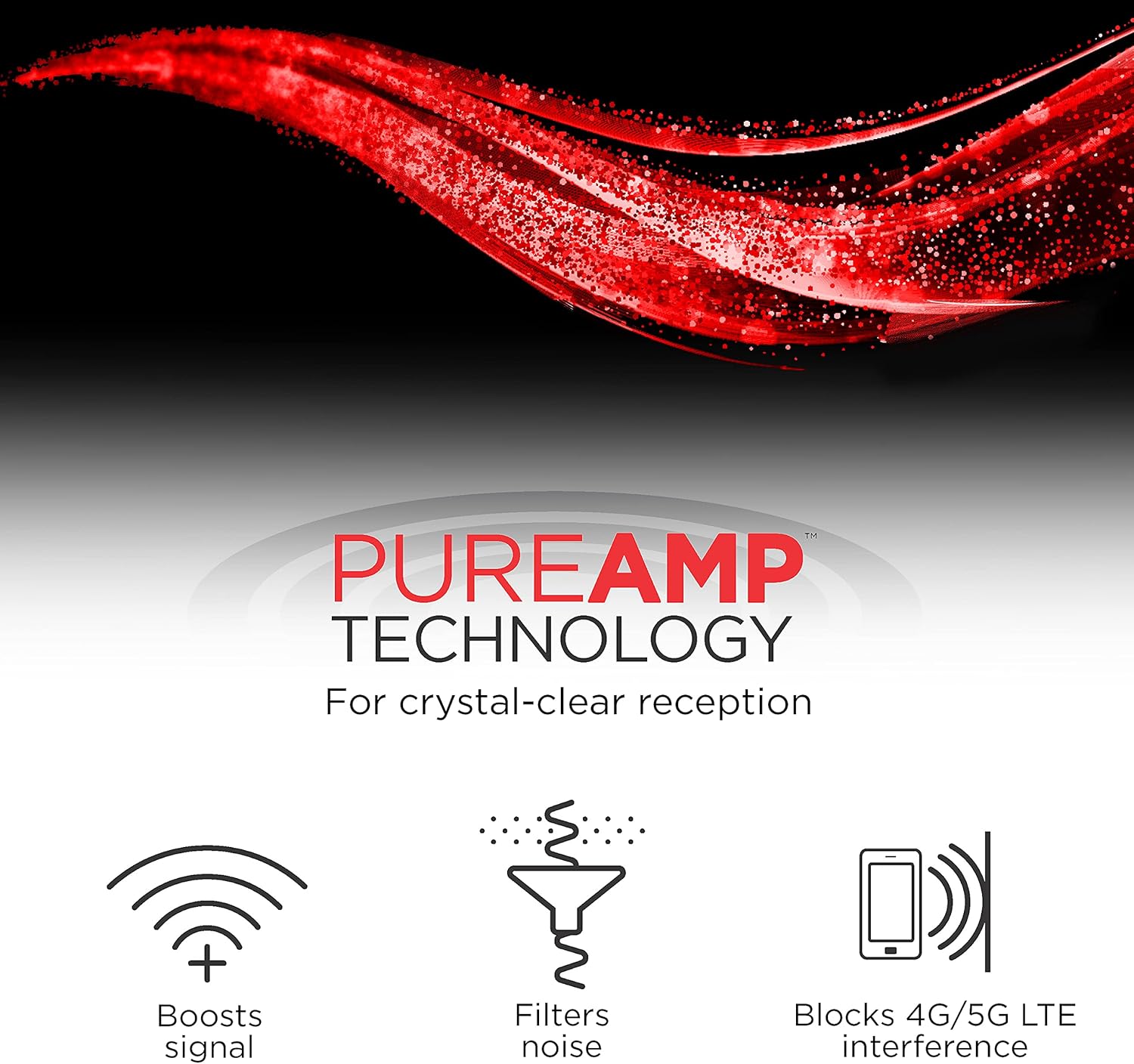 - PureAmp™ Technology: Features a built-in 4G/5G LTE filter designed to block unwanted cell phone signals, ensuring that your VHF and UHF broadcast signals remain crisp and clear.