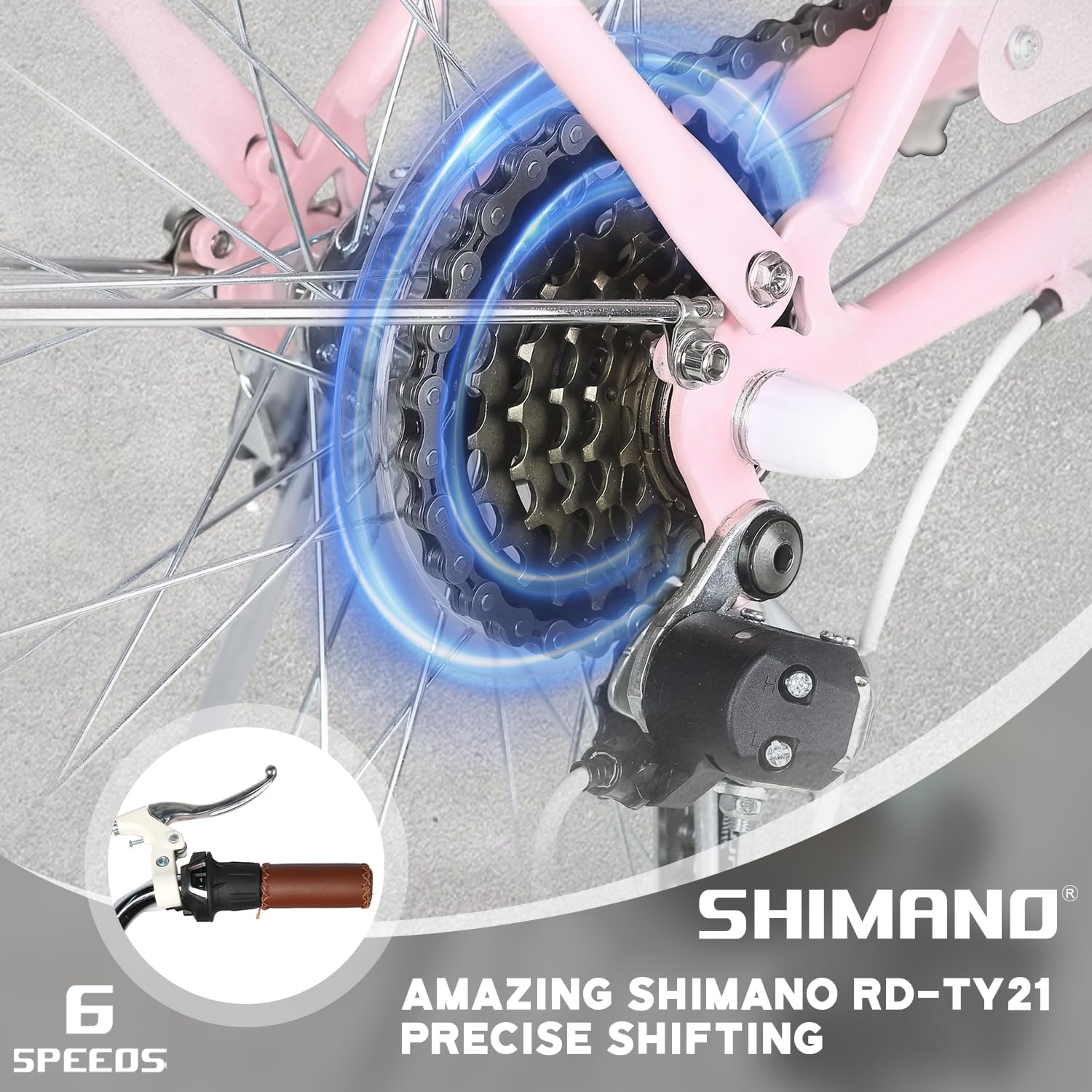At the heart of this bike is a durable High-Carbon Steel frame that absorbs vibration, paired with a responsive Shimano 6-speed gear system. This combination allows young riders to conquer steep hills and handle long-distance commutes with ease, while still being perfect for leisurely weekend rides. The retro aesthetic is highlighted by a charming wicker basket and a premium brown synthetic leather saddle, making it a head-turning gift for any “princess” on the go.