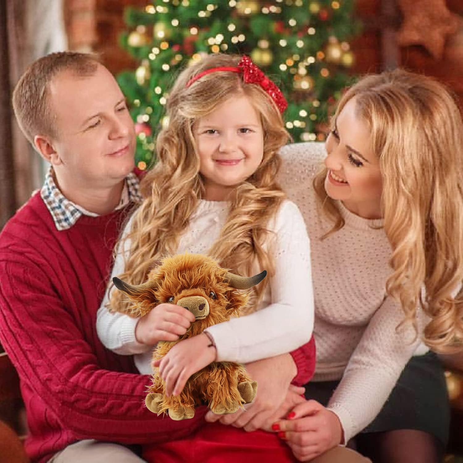 • ADORABLE HIGHLAND COW DESIGN: Features realistic shaggy fur, long horns, and expressive eyes, capturing the unique charm of Scottish Highland cattle in a huggable 11-inch form.