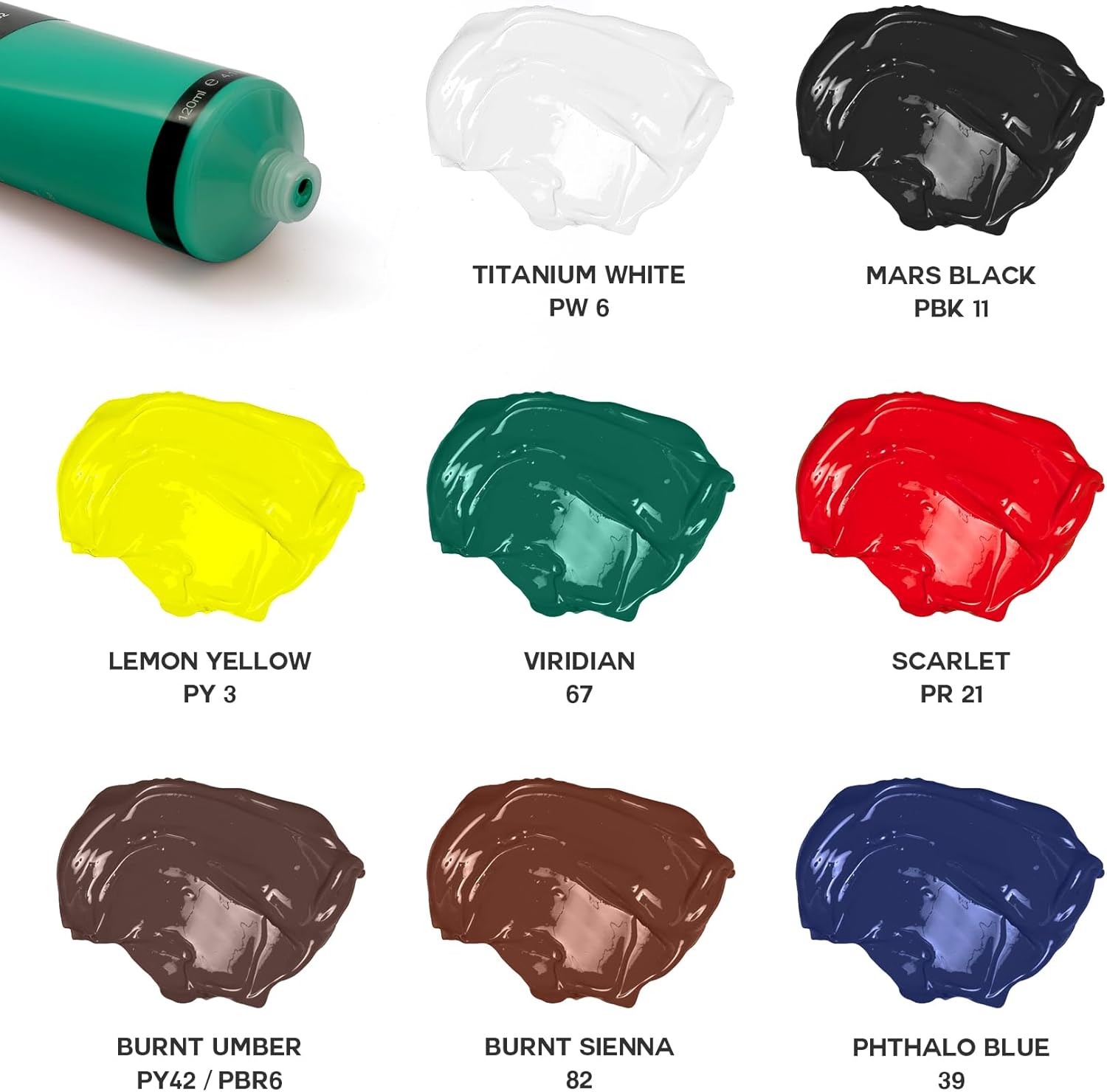 – Colors: 8 Primary Colors (Titanium White, Black, Scarlet, Sap Green, Lemon Yellow, Cerulean Blue)