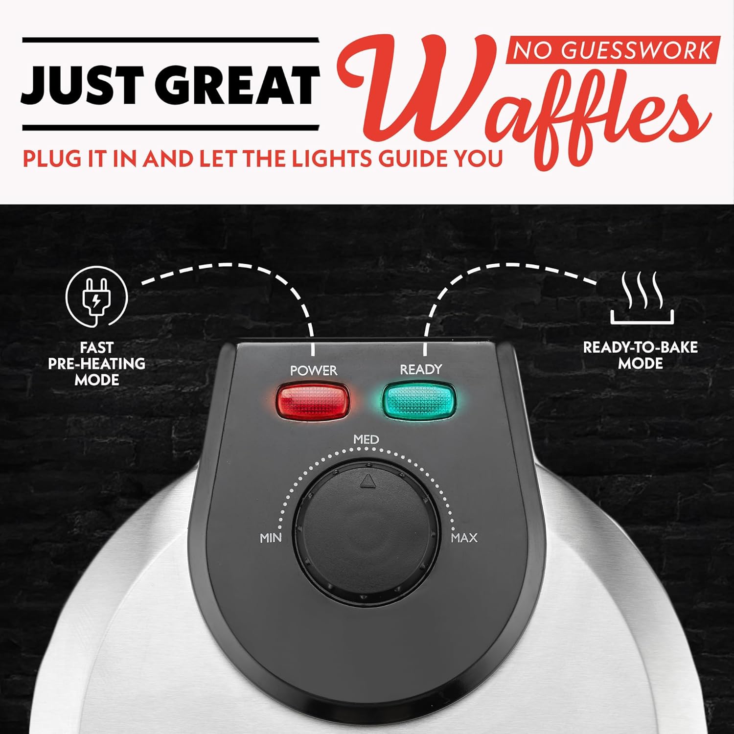Eliminate the guesswork with built-in indicator lights. The ‘Power’ light illuminates when the unit is preheating, and the ‘Ready’ light signals when the plates are hot enough to pour your batter, guaranteeing perfectly cooked waffles in minutes.