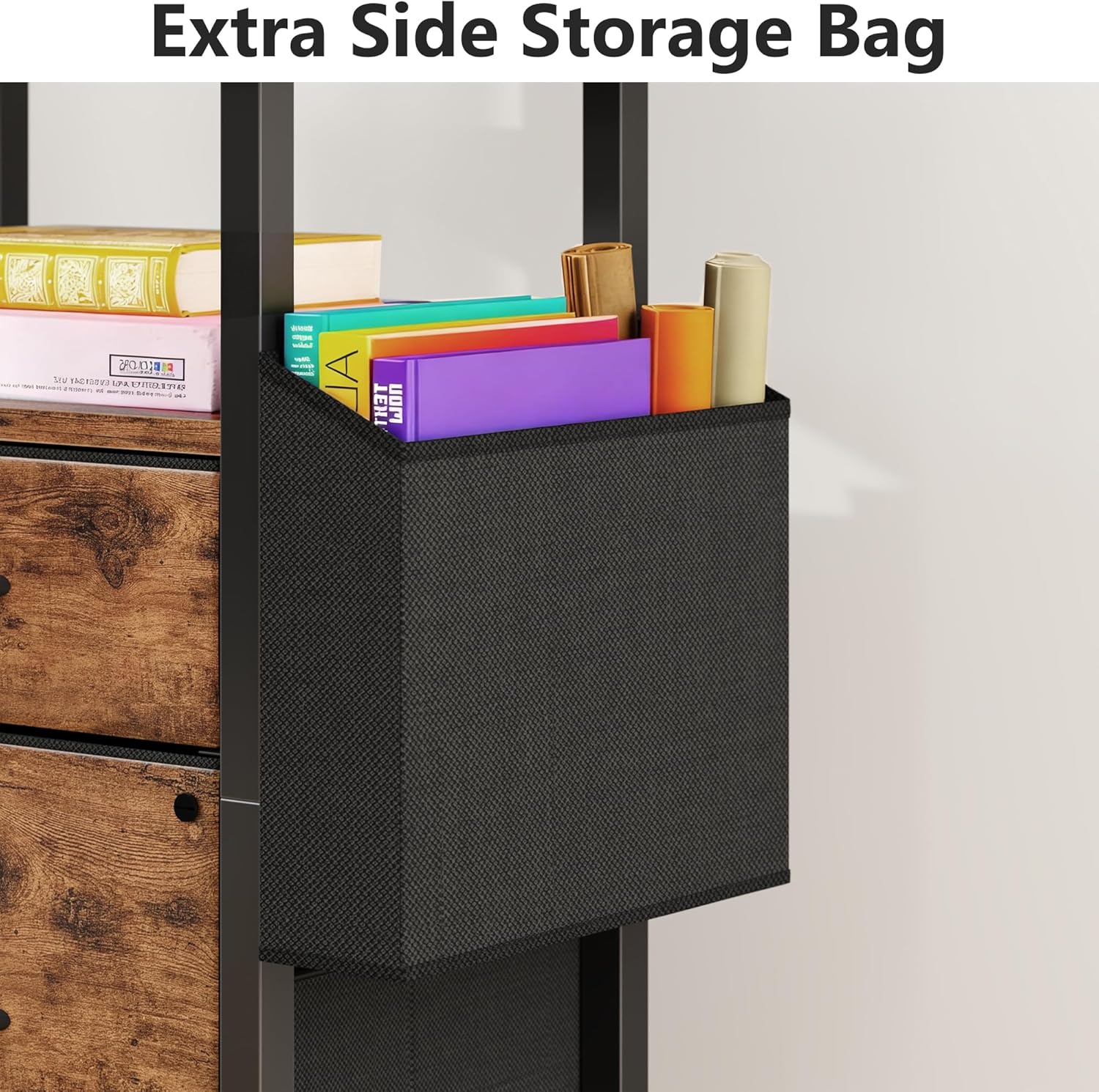 Experience unparalleled storage versatility. The bottom drawer is fully compatible with A4 and Letter-sized hanging file folders, ensuring your documents remain neatly sorted and accessible. Above it, a fabric drawer offers a hidden space for miscellaneous office supplies or personal items. The unit also features a convenient open storage shelf and a unique side storage bag—perfect for stowing away notepads, books, or stationery, keeping your desktop tidy.