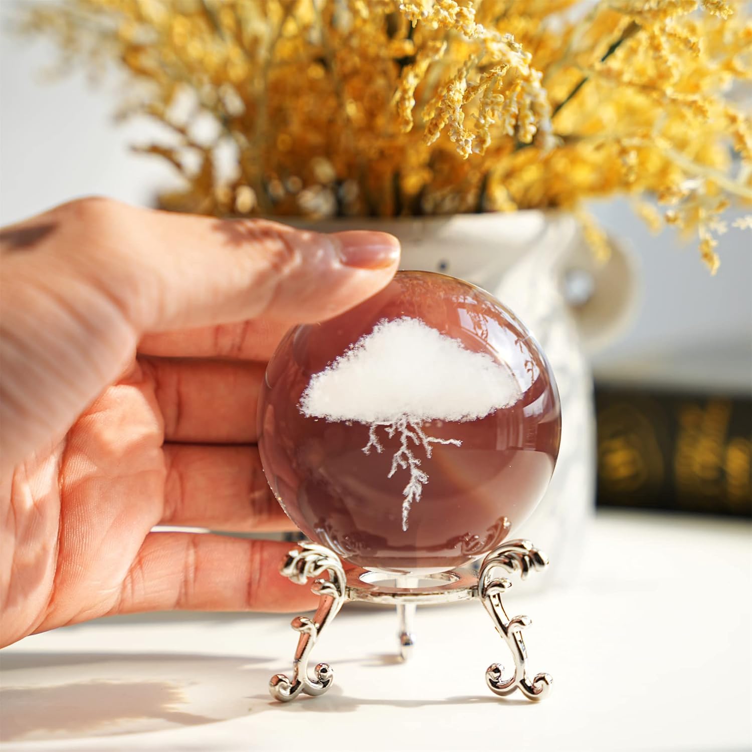Elevate your space with the HDCRYSTALGIFTS 3D Lightning Cloud Crystal Ball. Meticulously crafted from premium K9 optical crystal, this 60mm (2.3-inch) sphere features an awe-inspiring, internally laser-engraved storm cloud design that creates a striking 3D illusion.