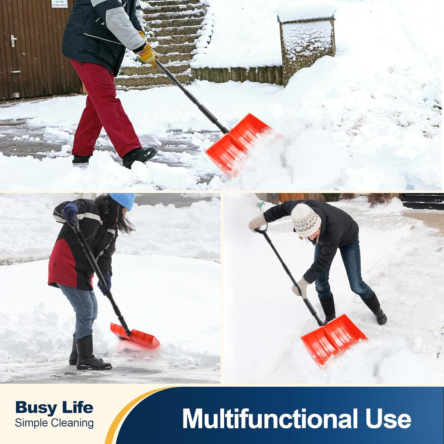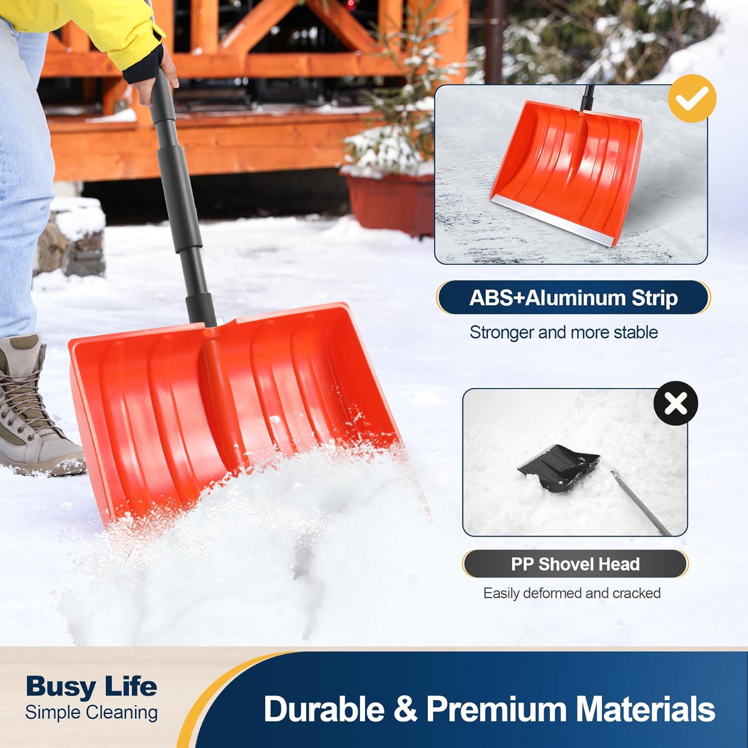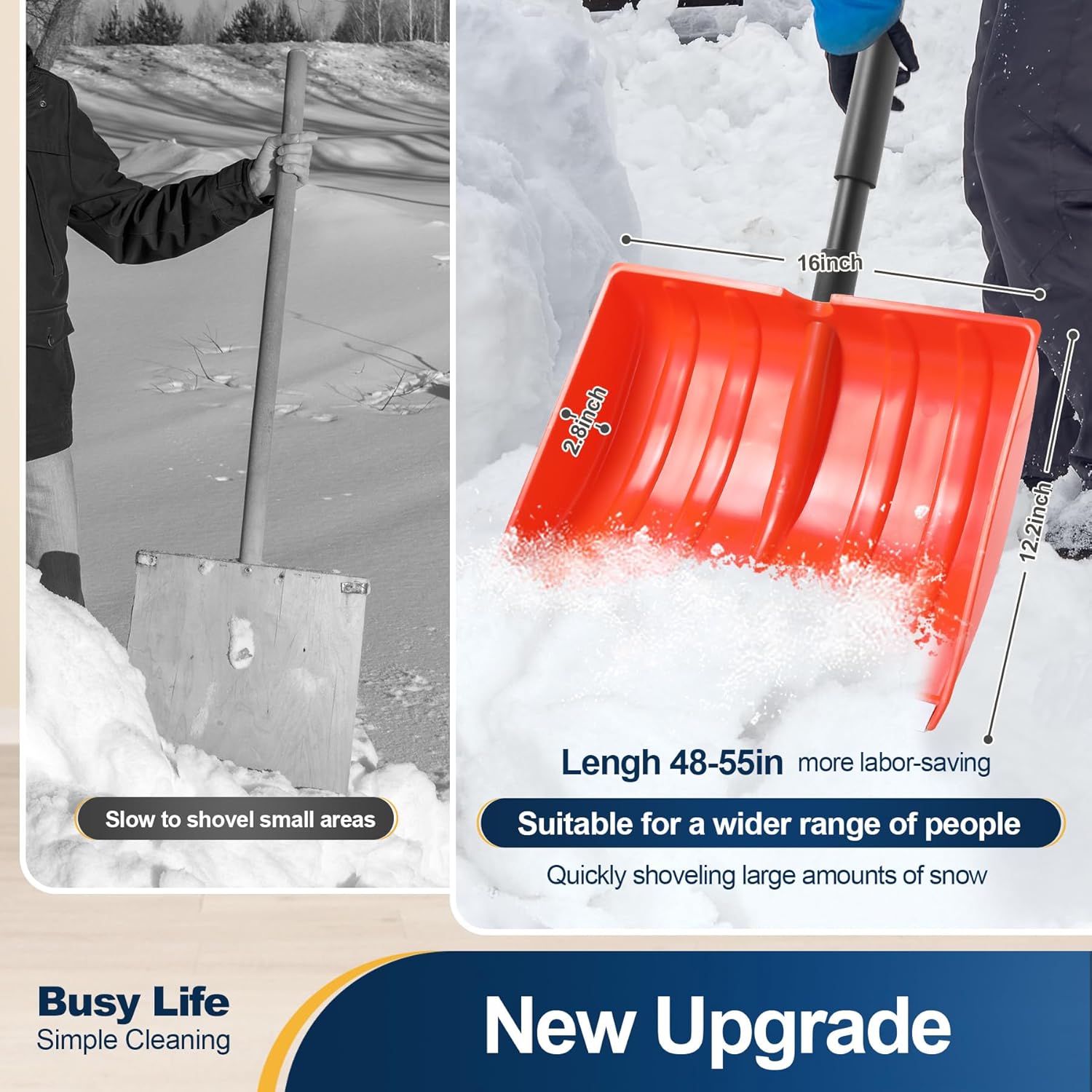 • CONQUER WINTER IN COMFORT: Say goodbye to backaches and muscle strain! Our ergonomically designed snow shovel features a dual D-grip handle that promotes a natural lifting posture. The 55-inch length is perfectly adjustable from 48 to 55 inches, so you can find your ideal height and clear snow without painful bending or straining.