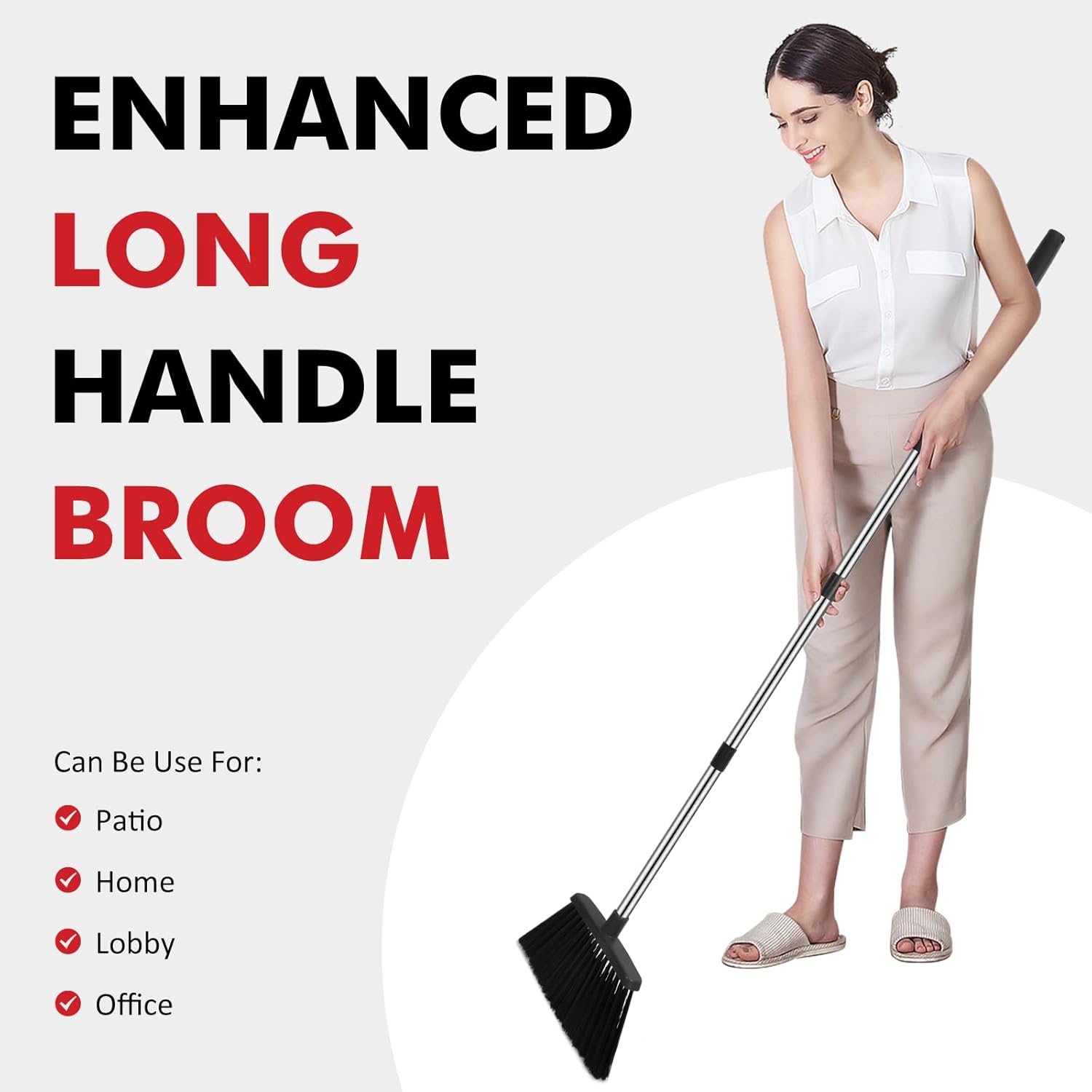 Stop straining your back! Our broom features a 55-inch long handle (adjustable up to 56 inches), allowing you to clean wide open spaces without constantly bending over. Whether you are sweeping a large warehouse floor or your garage, the extended handle ensures you maintain a comfortable posture during long cleaning sessions.