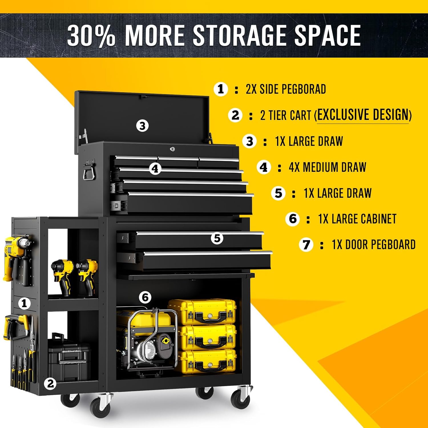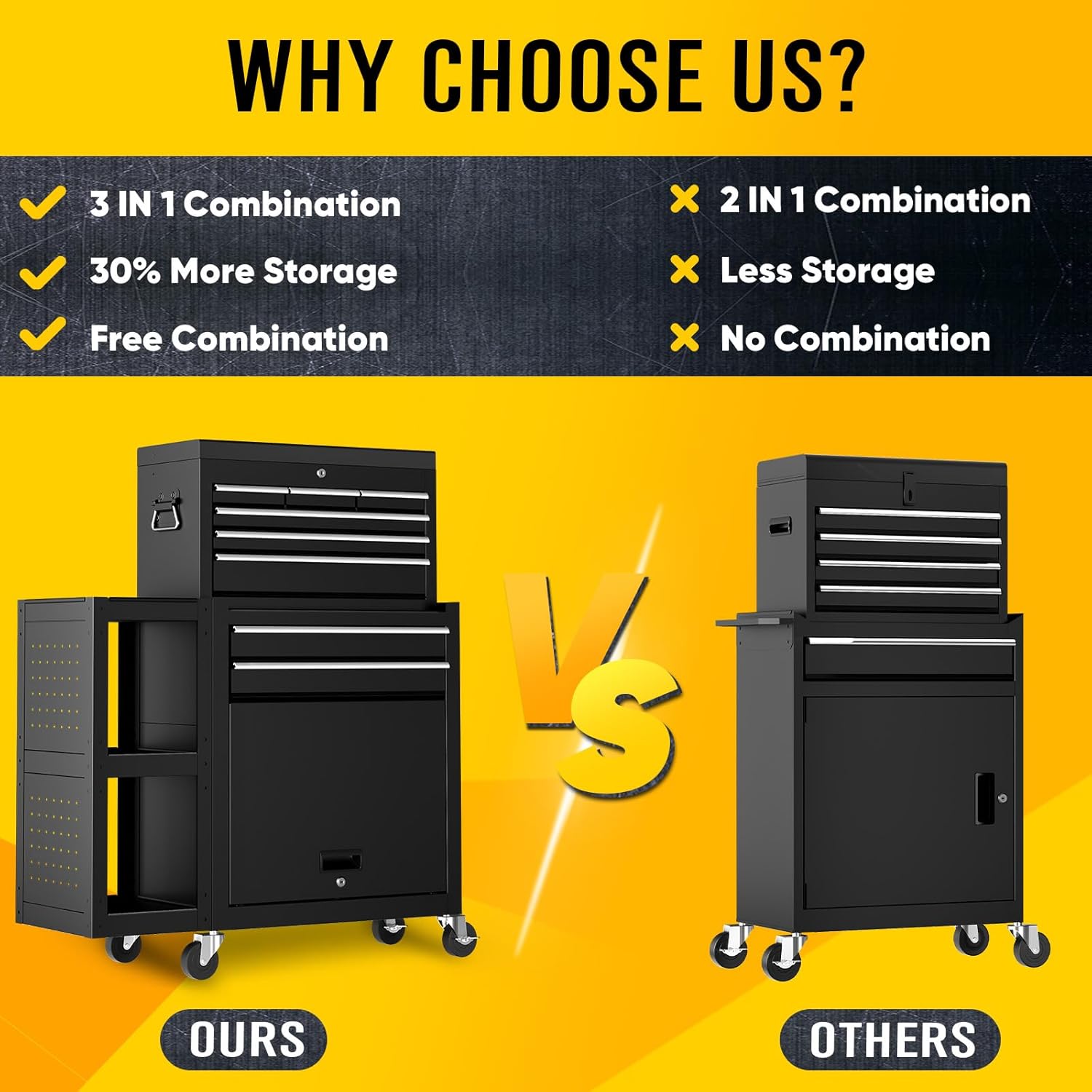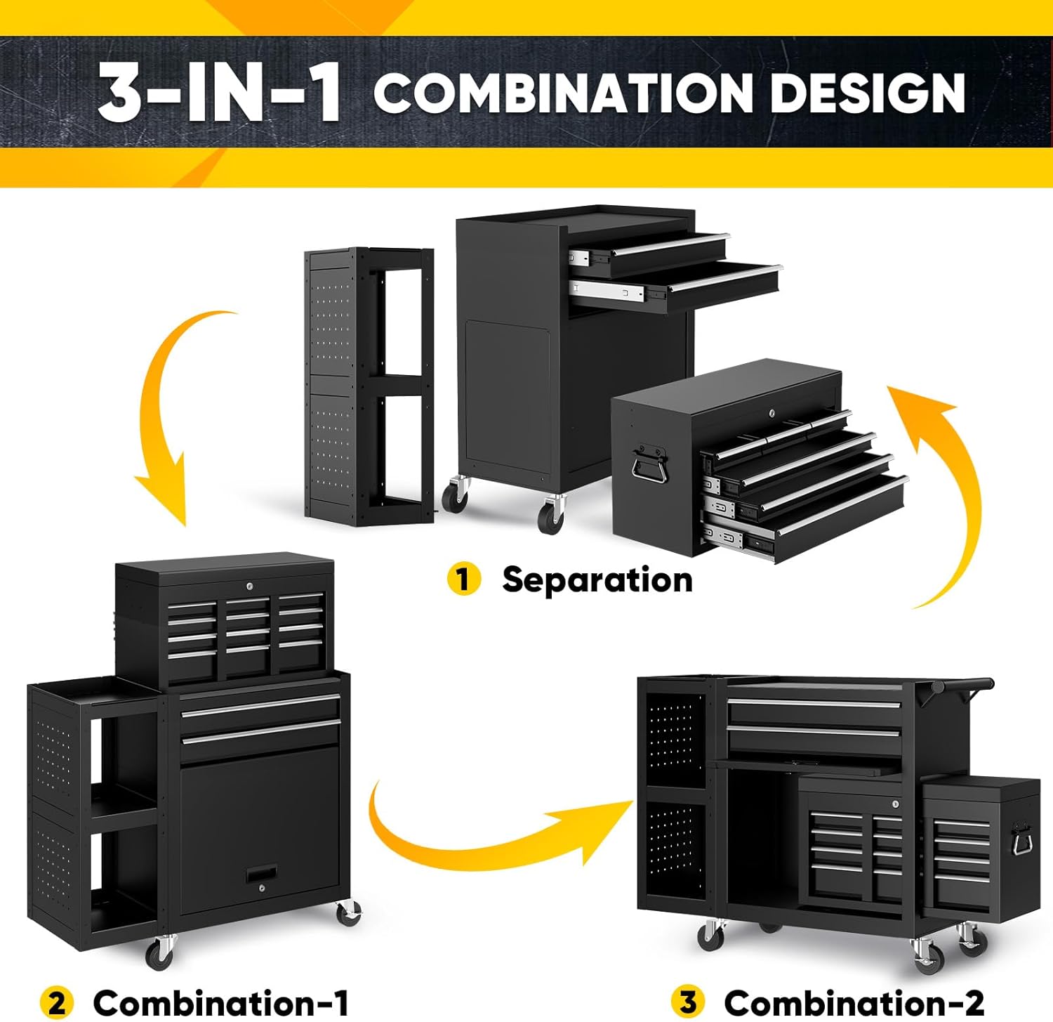 Revolutionize your workflow with our newly upgraded 8-Drawer Rolling Tool Chest. Designed for mechanics, woodworkers, and DIY enthusiasts, this 3-in-1 system features a detachable top toolbox, a middle removable tool tray, and a spacious bottom cabinet, offering 30% more storage than standard alternatives. Whether you are working in a professional garage or a home workshop, this unit adapts to your needs.