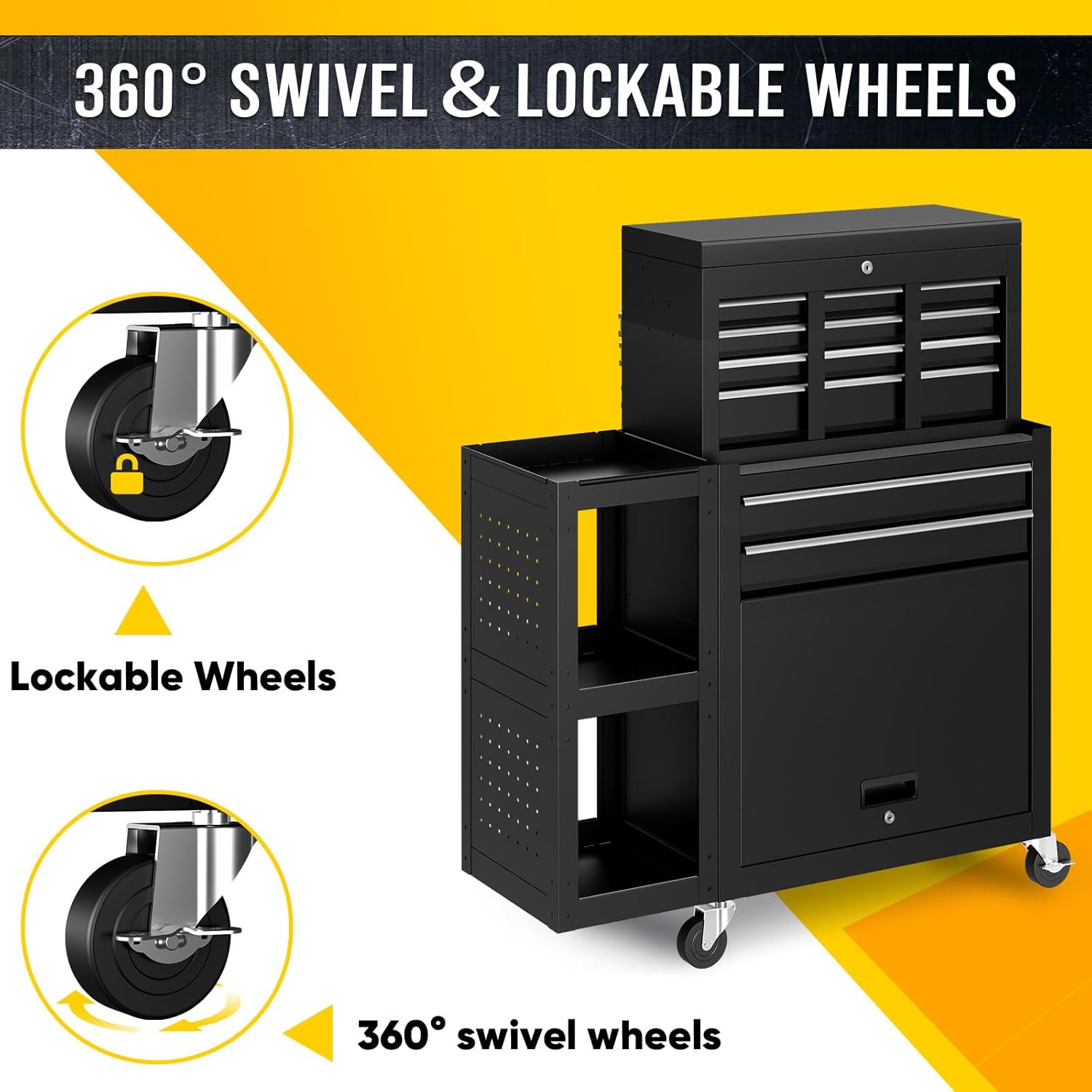 Keep your valuable assets safe and organized. The bottom cabinet features a secure locking mechanism to prevent unauthorized access. The unit includes 8 slide-out drawers of varying sizes (3 small, 5 large) and two side cabinets, providing dedicated space for everything from precision hand tools to bulky power equipment. The top toolbox is designed to nest inside the bottom cabinet when detached, saving valuable floor space.
