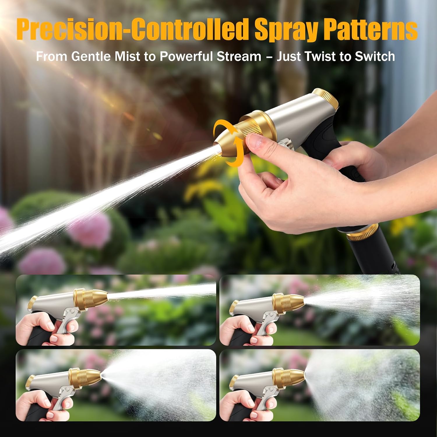 - 4 SPRAY PATTERNS: Effortlessly rotate the head to choose from Flat, Center, Cone, and Jet streams to handle every task from gentle plant watering to tough car washing.