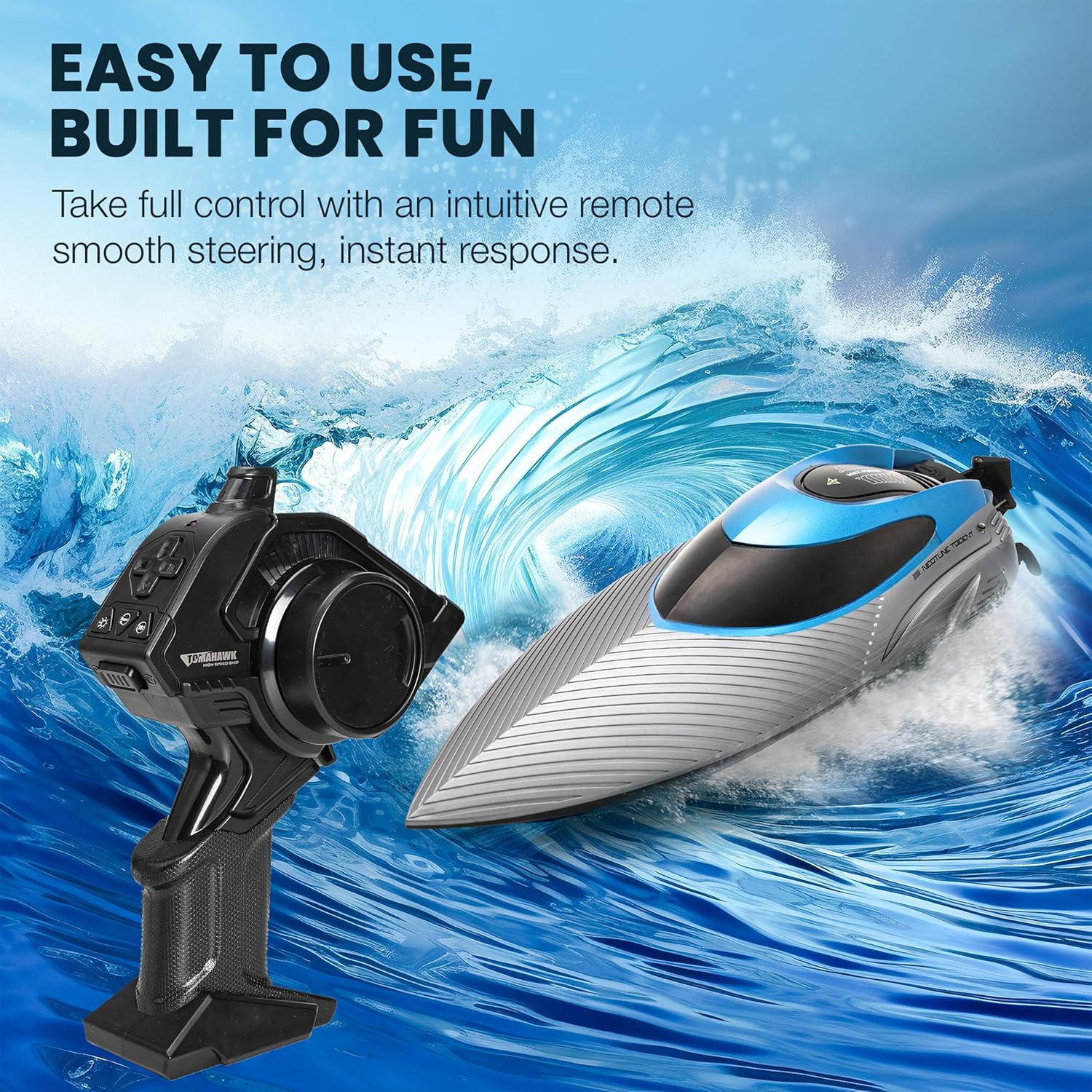 Durable & Safe Design: Constructed with impact-resistant ABS material and a waterproof double-hull design, this boat is built to last. The innovative self-righting feature automatically flips the boat back upright if it capsizes, so the action never stops. For added safety, the water-activated engine prevents the propeller from spinning out of the water, protecting both the user and the motor.