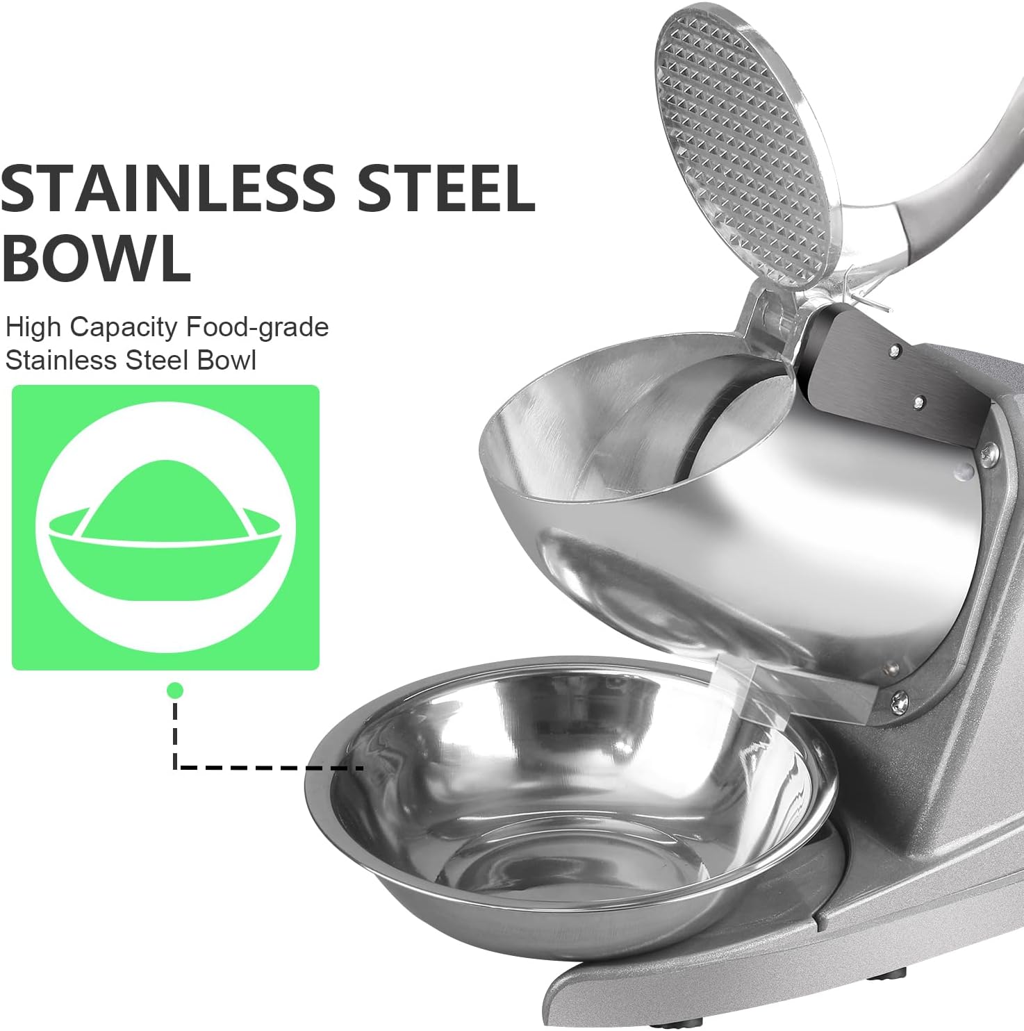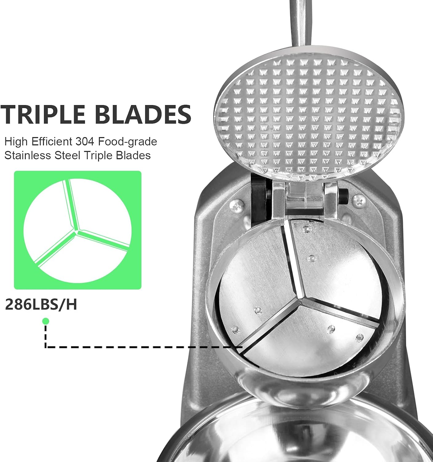 Durable & Hygienic Design: Crafted from corrosion-free, food-grade stainless steel, the heavy-duty bowl and blades are rust-proof and easy to clean. The machine sits on a stable, heavy cast base that reduces vibration during operation. The stylish 3D lattice cover effectively prevents ice splashing, keeping your serving area clean and mess-free.