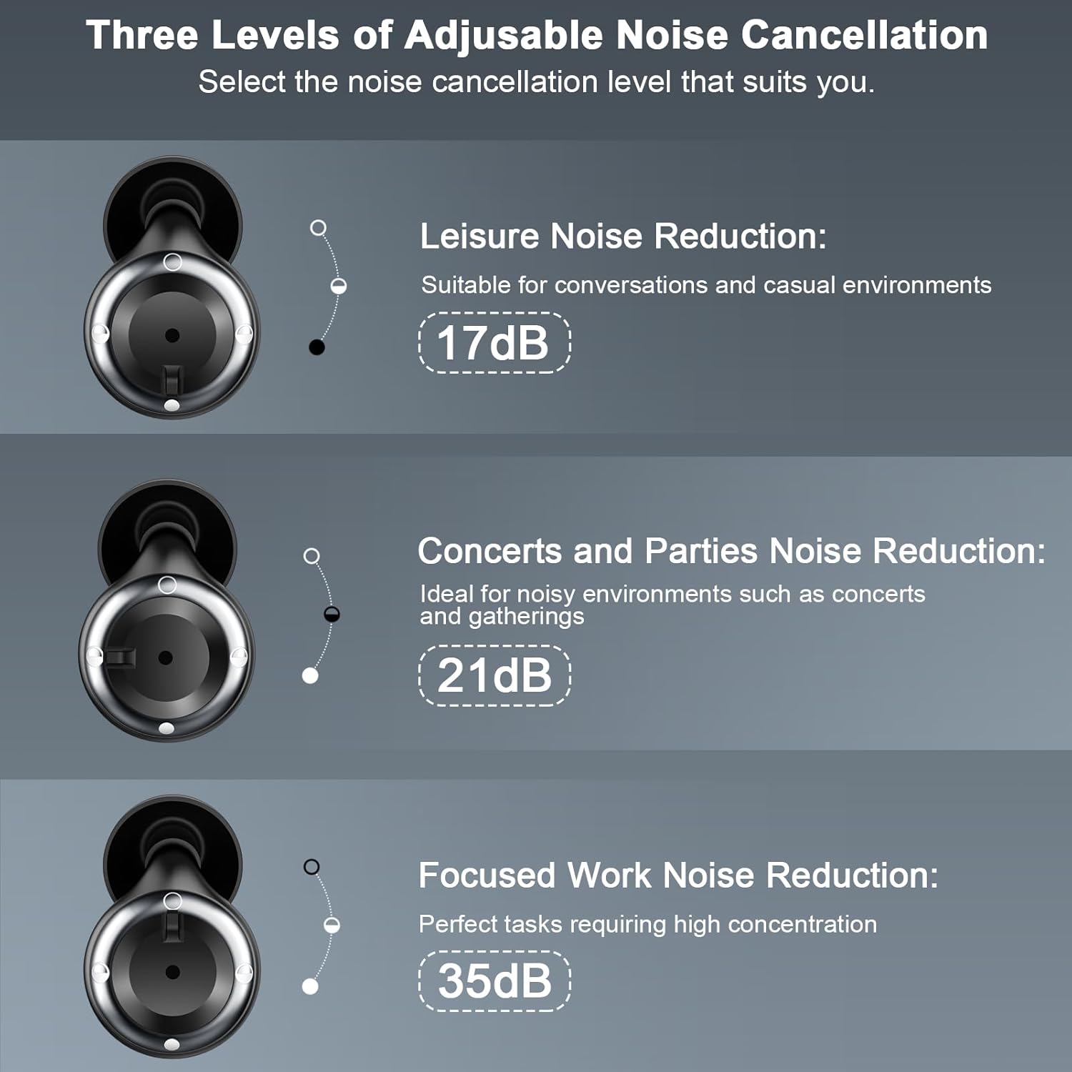 - 3-MODE NOISE CONTROL: Twist to adjust between 17dB (Office), 21dB (Sleeping), and 35dB (Concerts) noise reduction levels.